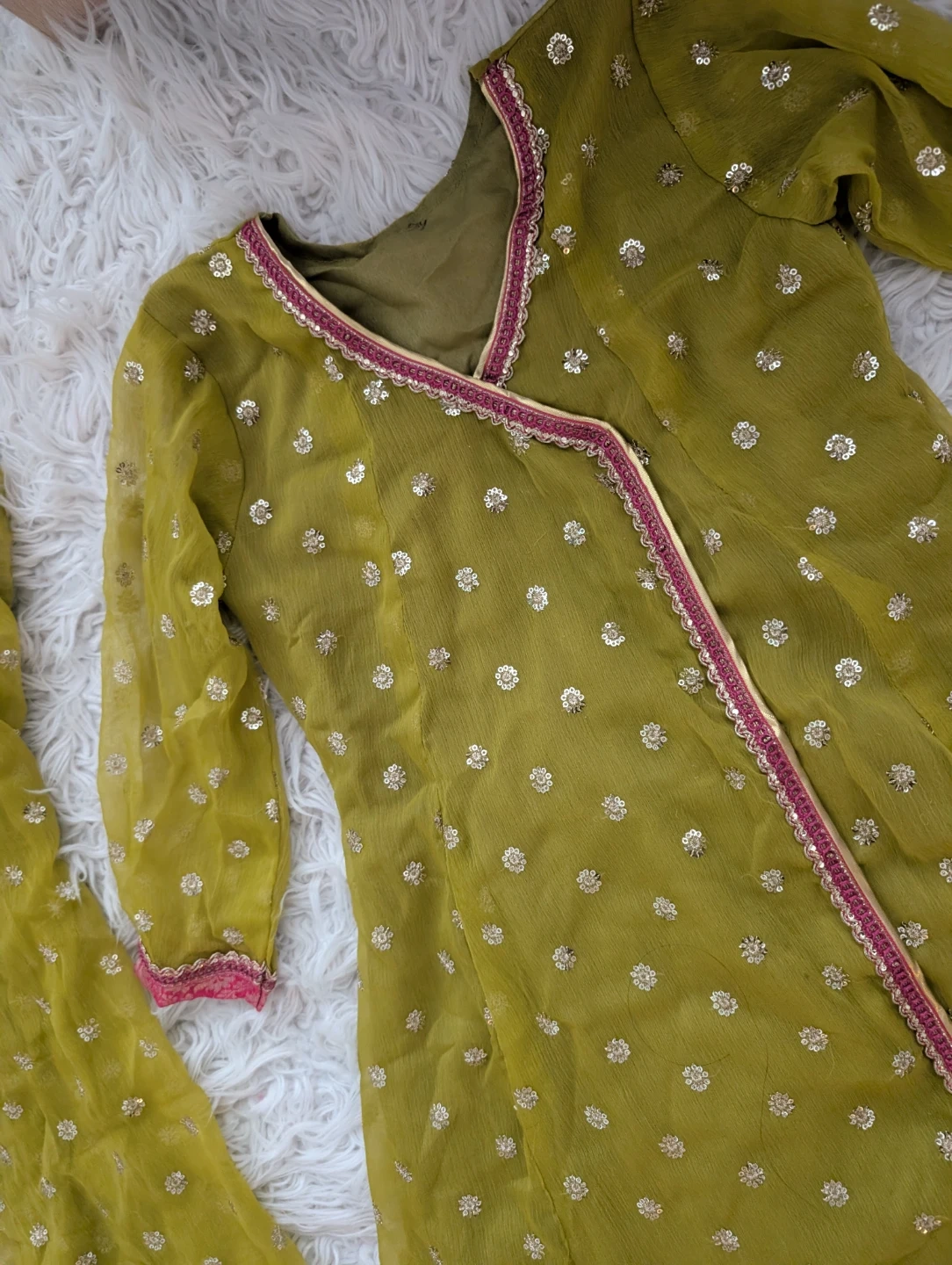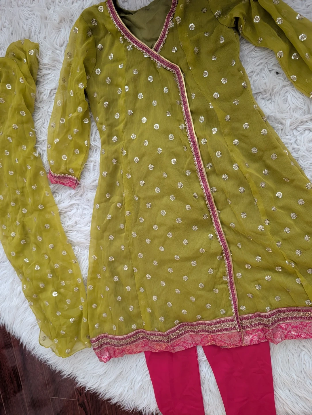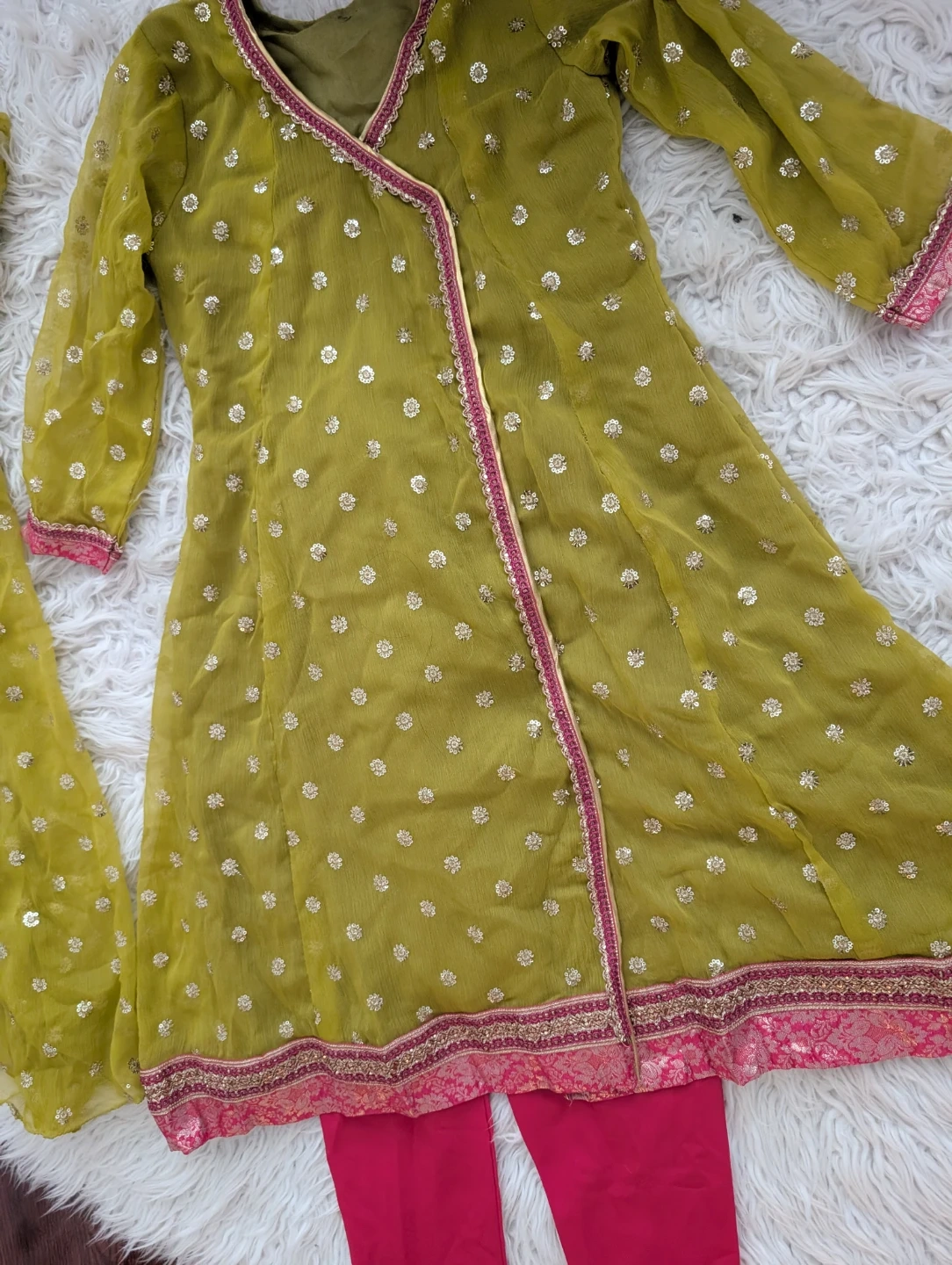 This is a lovely olive green kameez with delicate gold sequin work and pink trim. It comes with matching pink churidar. Perfect for festive occasions