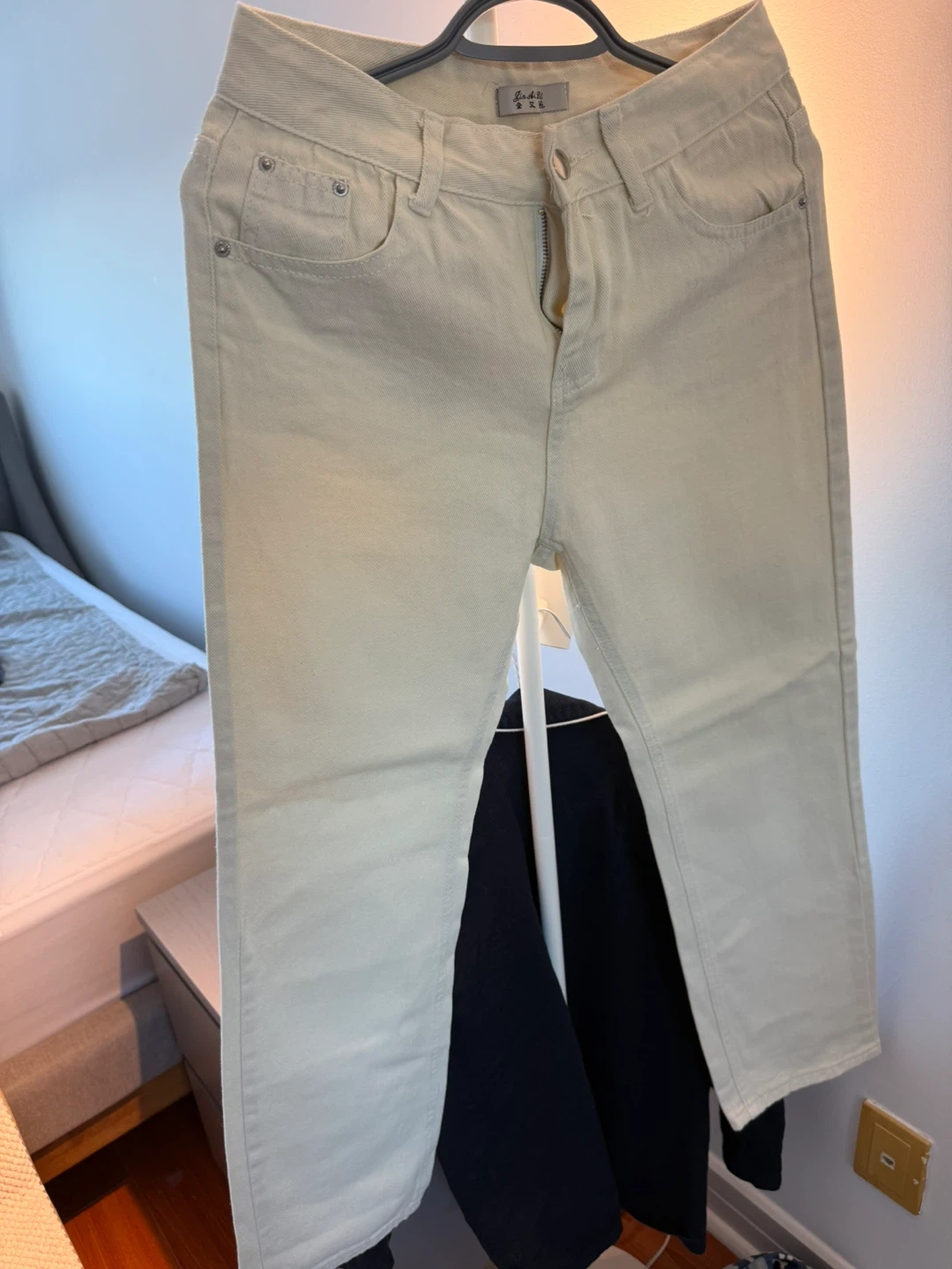 These are light beige jeans with a zip fly. They're made of a cotton blend. Classic five-pocket styling.