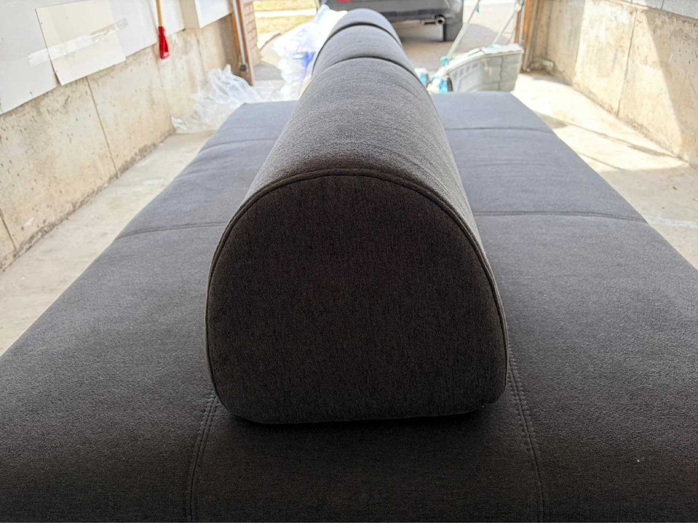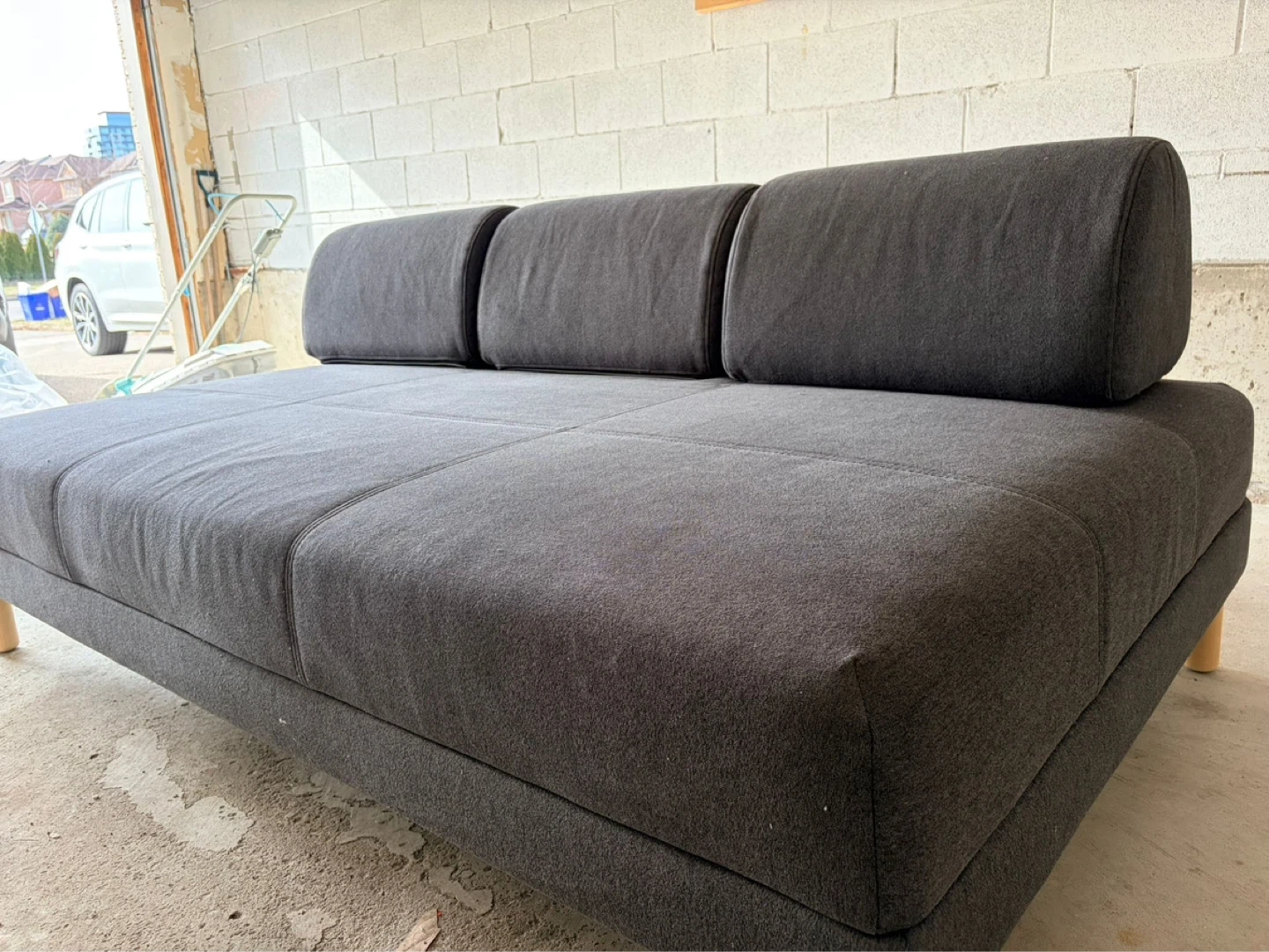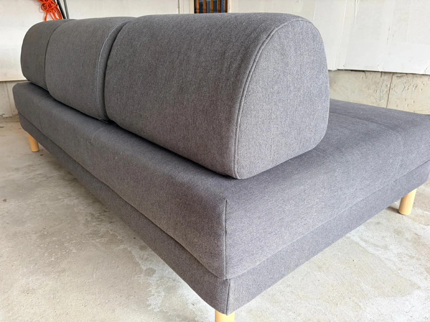 This dark grey sofa bed has a modern design with three plush back cushions. It's upholstered in a durable fabric and features wooden legs. The sofa easily converts into a bed, offering versatile functionality for your living space.