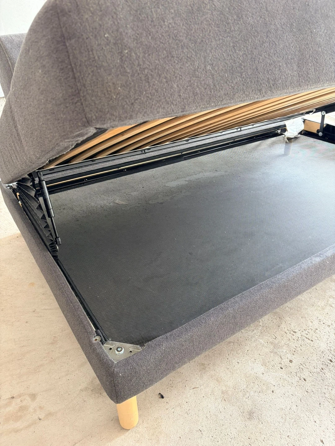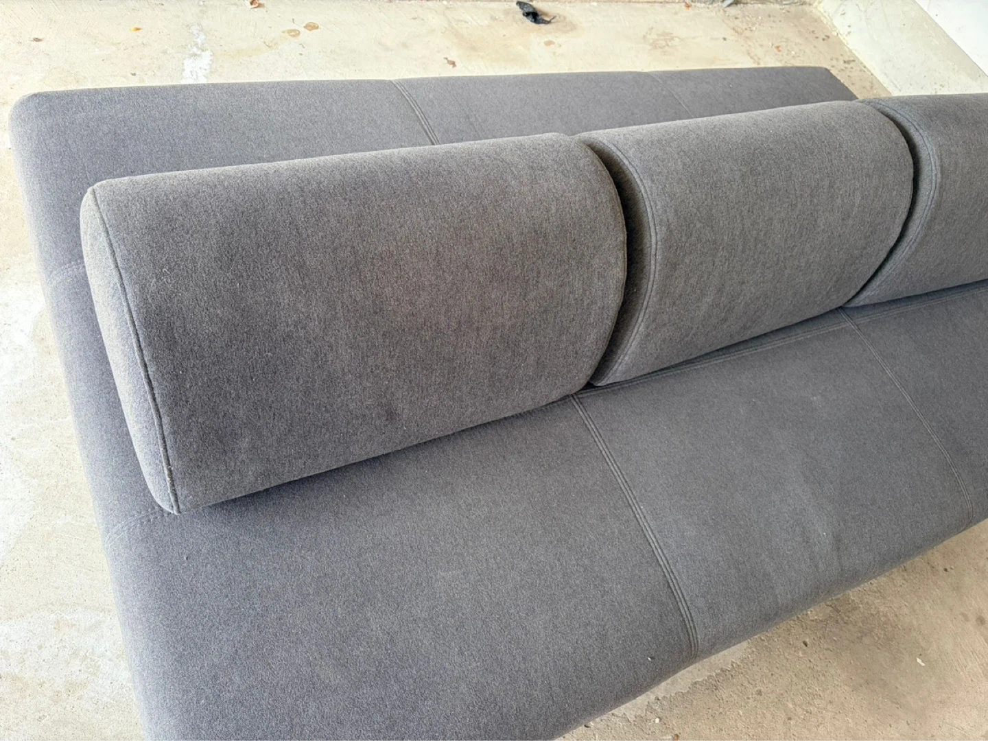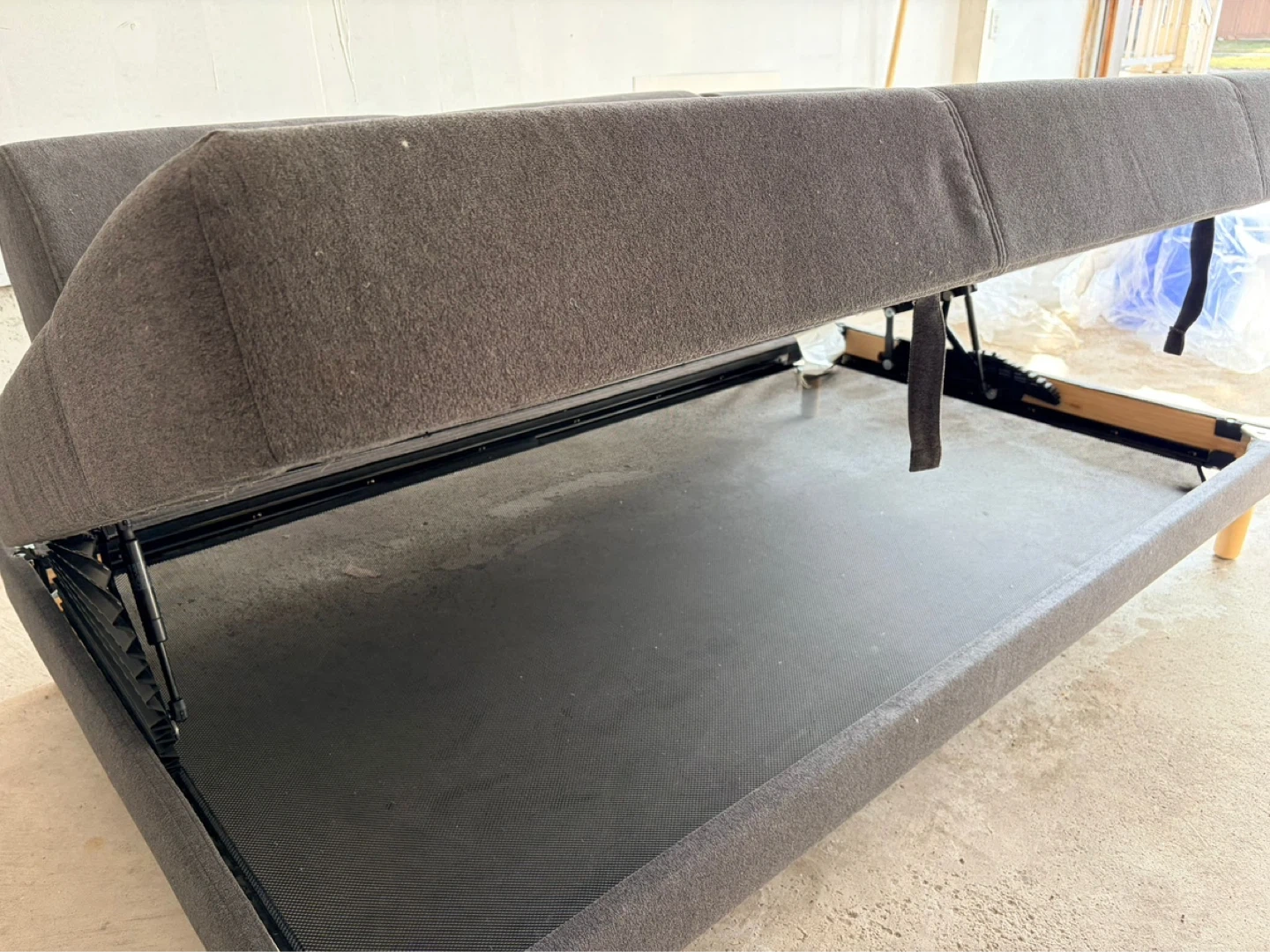 This dark grey sofa bed has a modern design with three plush back cushions. It's upholstered in a durable fabric and features wooden legs. The sofa easily converts into a bed, offering versatile functionality for your living space.