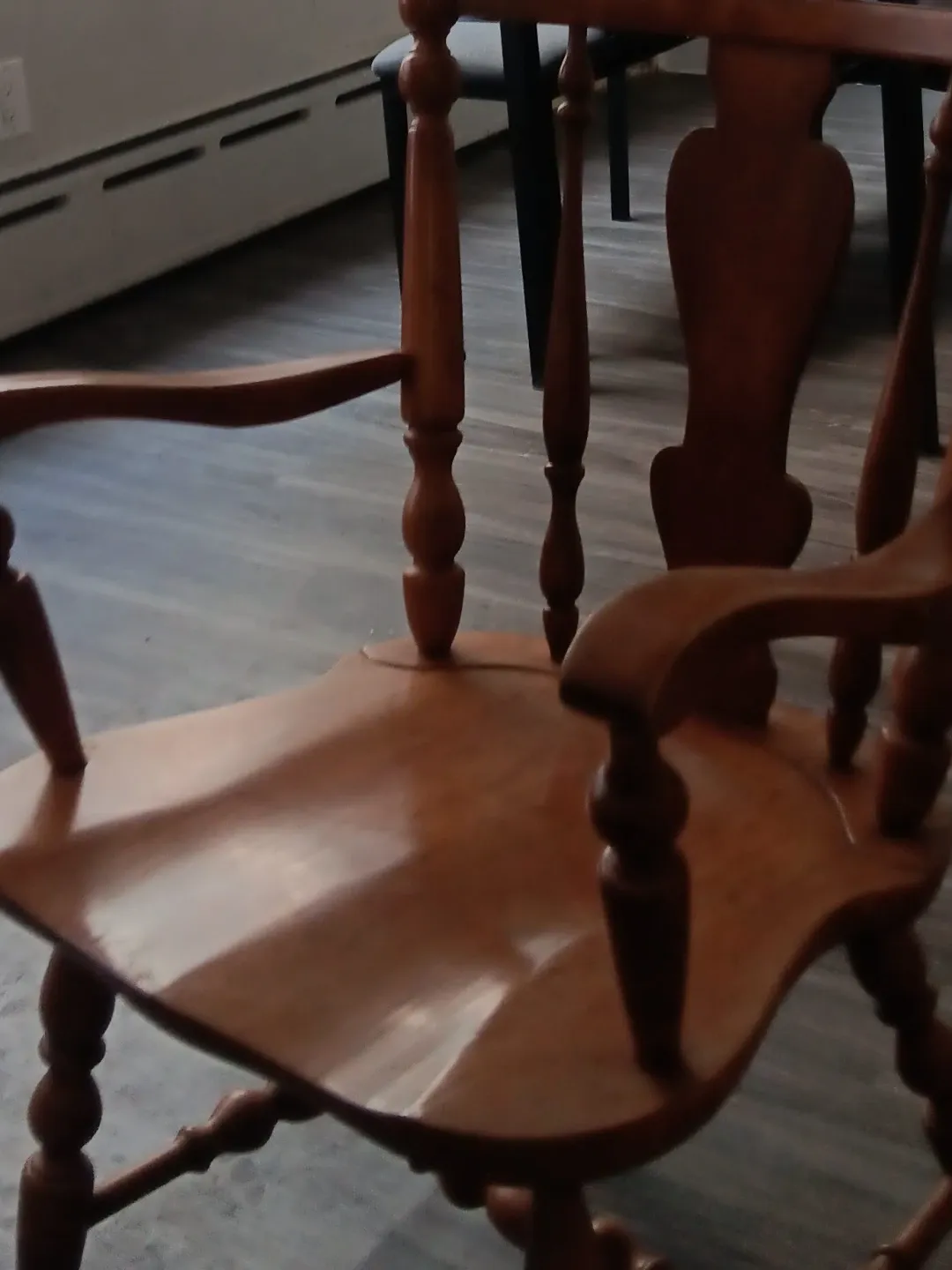 This is a classic wooden armchair with a warm, natural finish. It features a spindle back and turned legs for a traditional look. Solid wood construction.