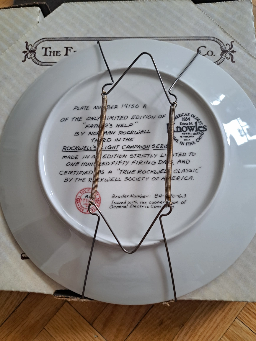 This is the limited edition collector plate "Father's Help" by Norman Rockwell. It's the third in The Rockwell's Light Campaign Series, made in an edition strictly limited to one hundred fifty firing days. Certified as a "True Rockwell Classic" by the Rockwell Society of America.
