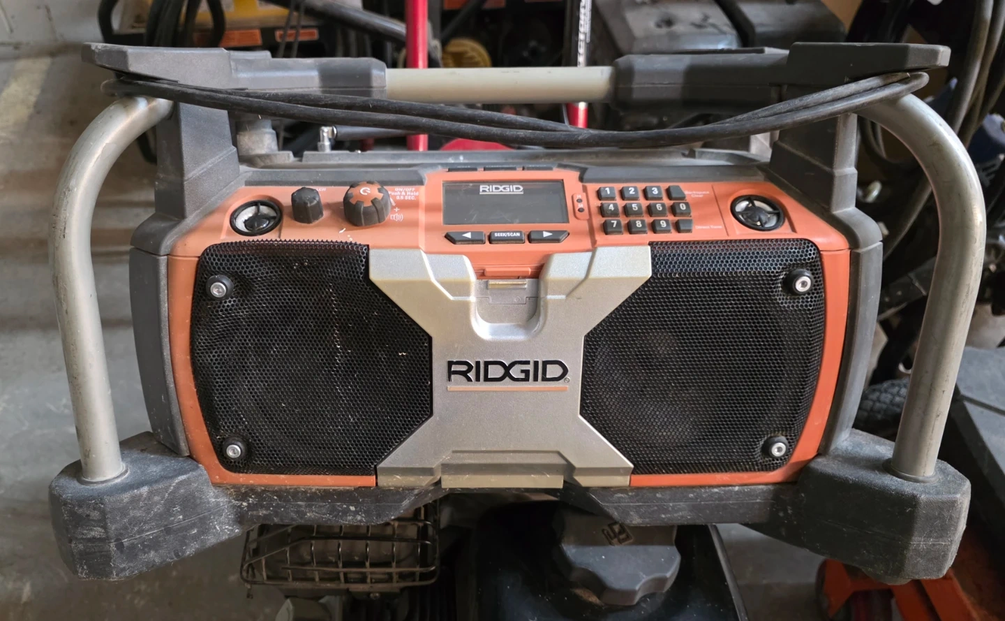 This is a RIDGID jobsite radio. It features a durable design with a metal handle and speaker grilles. Includes a digital display and keypad for station selection.