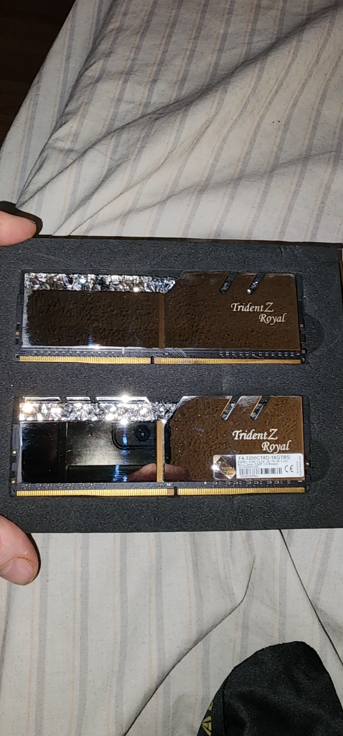 Four 8GB sticks of G.Skill Trident Z Royal DDR4 RAM. Model F4-3200C16D-16GTRS. DDR4 3200 speed. Amazing ram for gaming setups.