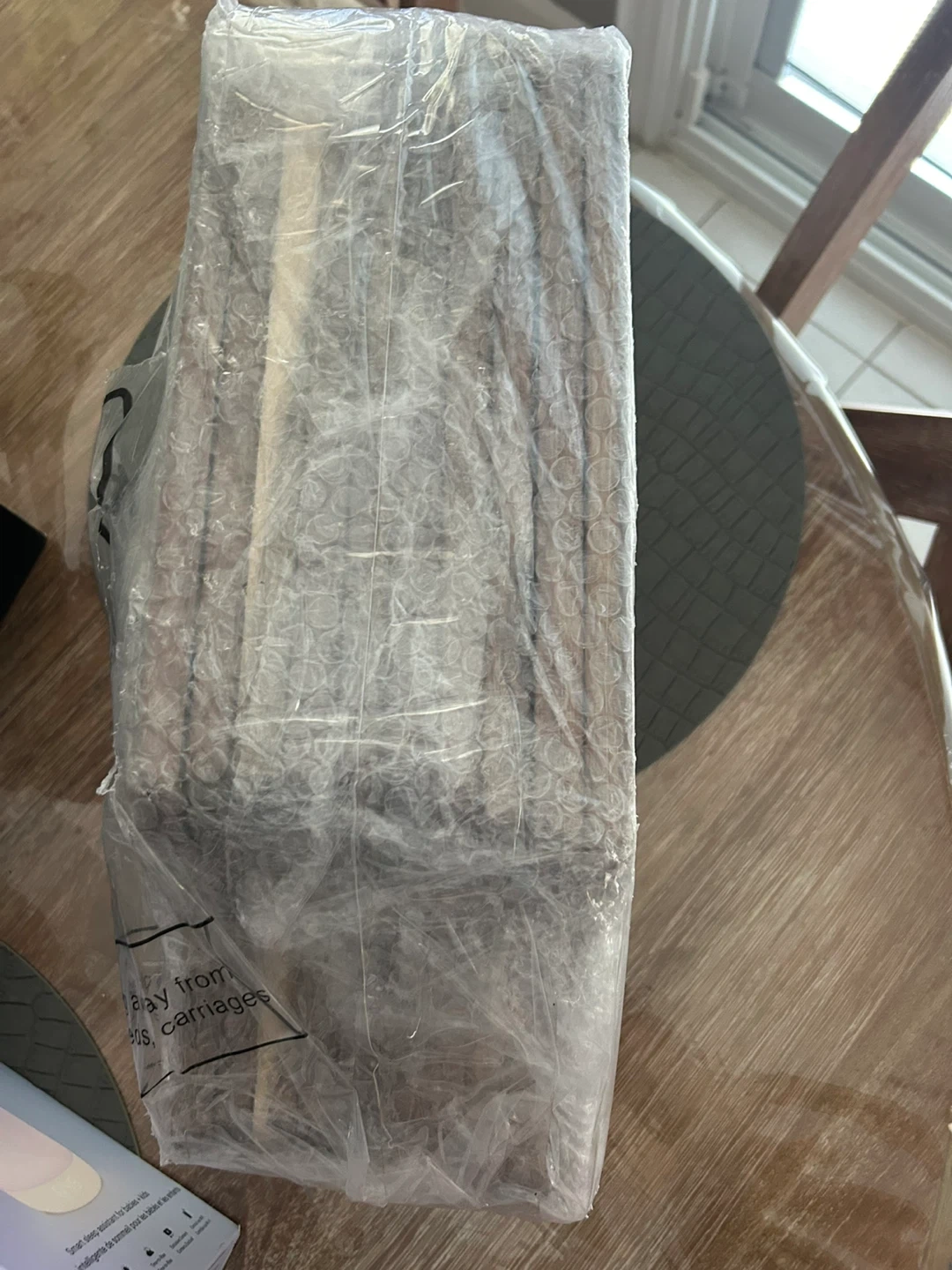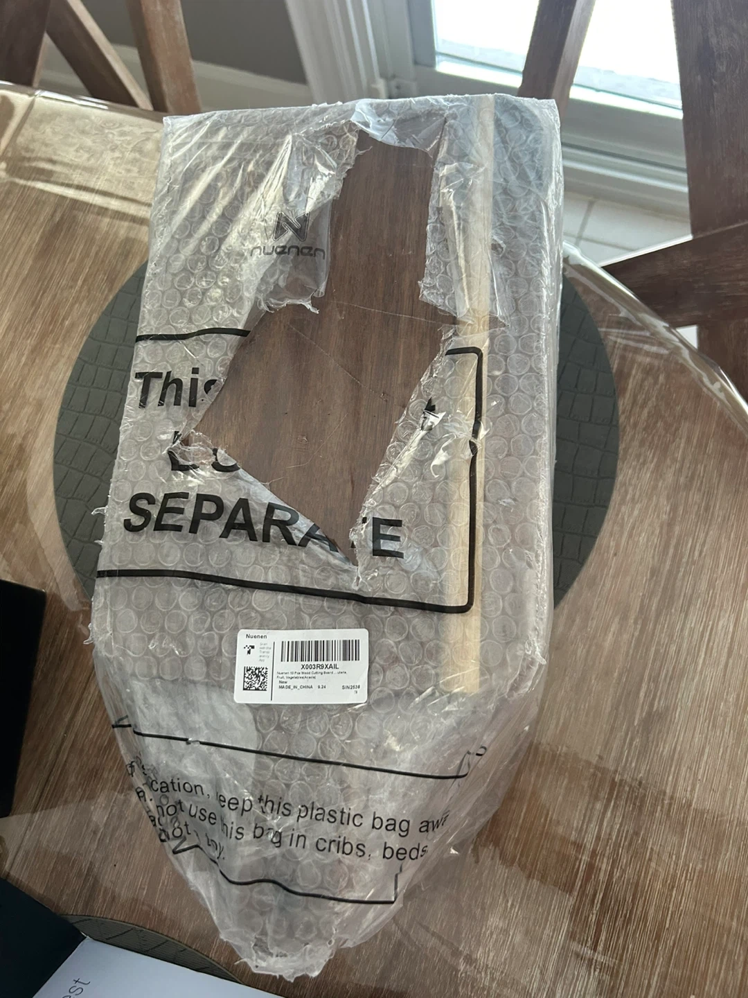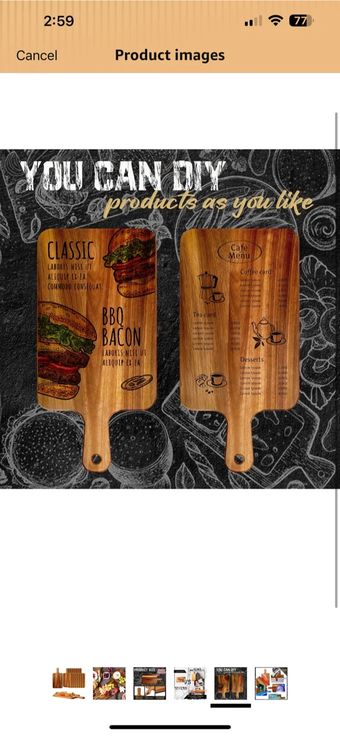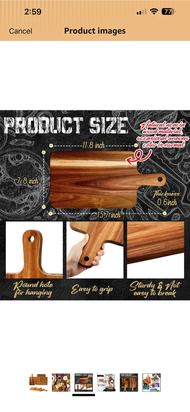 This is a Nuenen acacia wood serving board. It's 15.7 x 7.8 inches with a thickness of 0.6 inches. It has a round hole for hanging and is easy to grip. Sturdy and not easy to break!