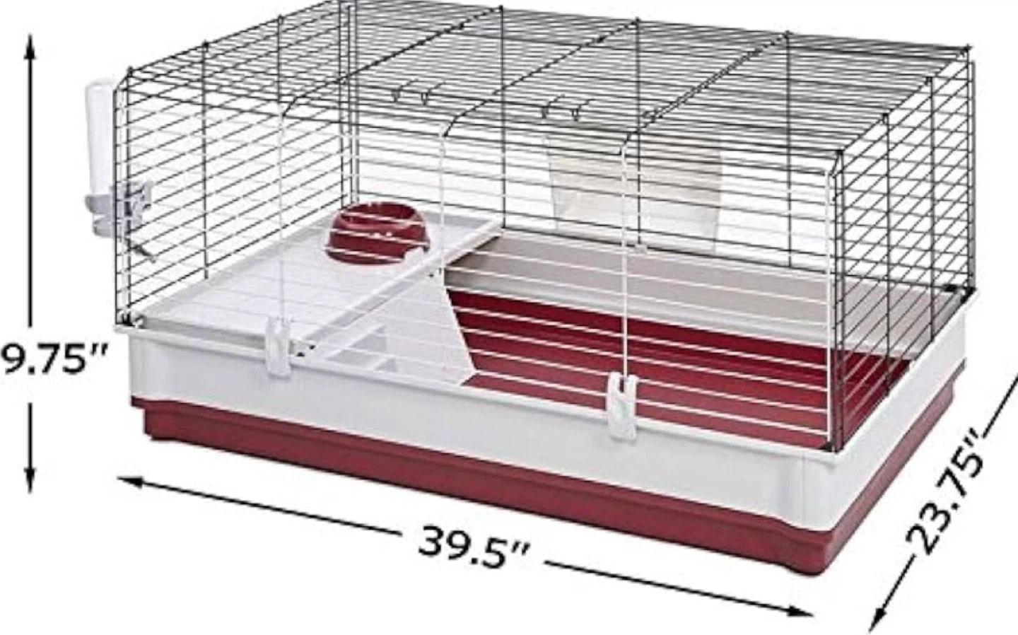 Spacious wire cage with multiple levels and a ramp. Includes a water bottle and food dish. It's a great habitat for small pets like rabbits or guinea pigs. Dimensions are 39.5" L x 23.75" W x 9.75" H.