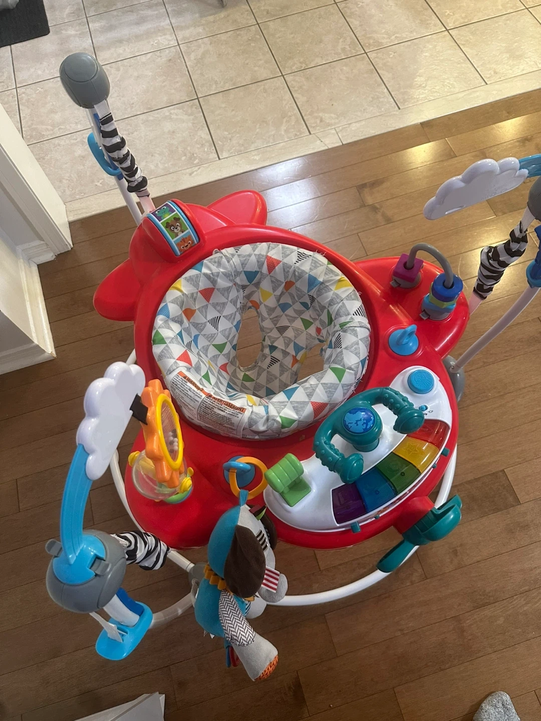 Fisher-Price Jumperoo with various engaging toys and activities for baby. It's designed for playtime and exploration. Some toys on the overhead bar may be missing.