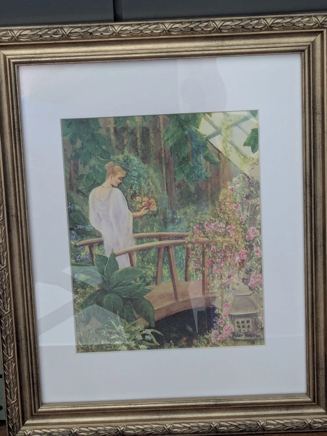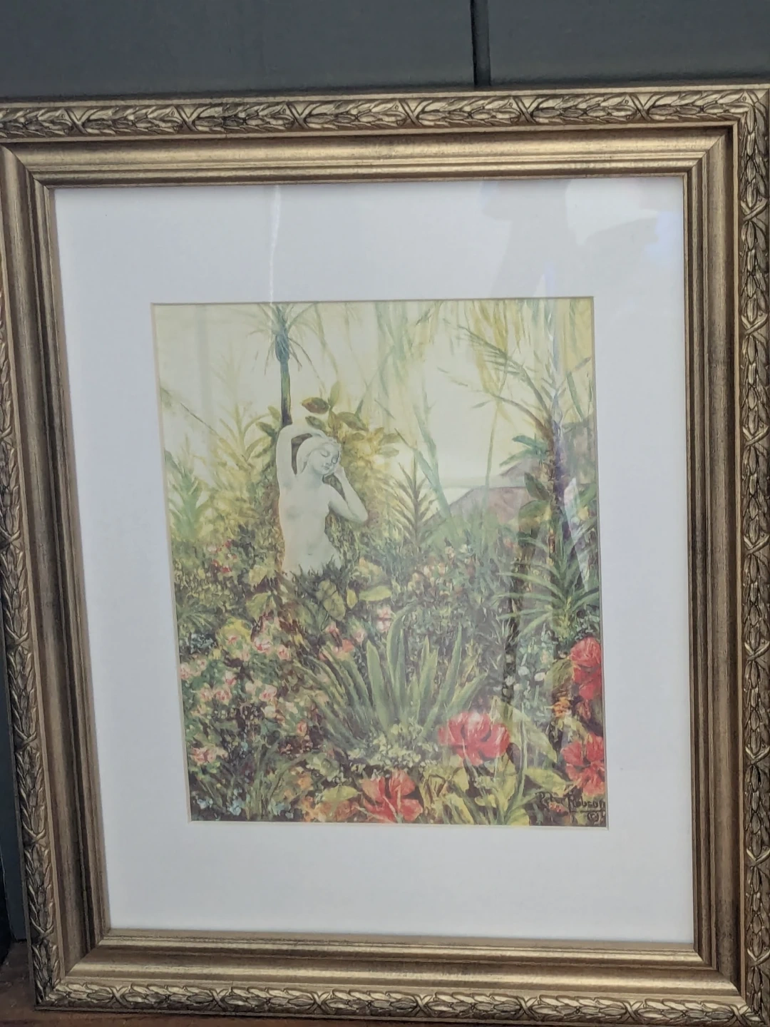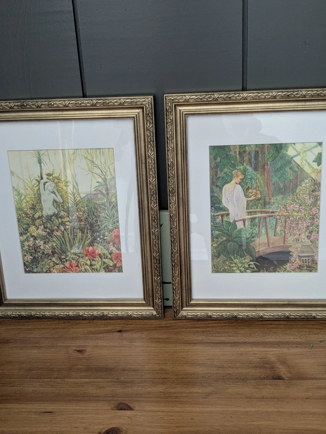 Two framed art prints featuring serene garden scenes with classical figures. Each print showcases lush greenery and floral details. Comes in ornate gold-tone frames. Measurements are