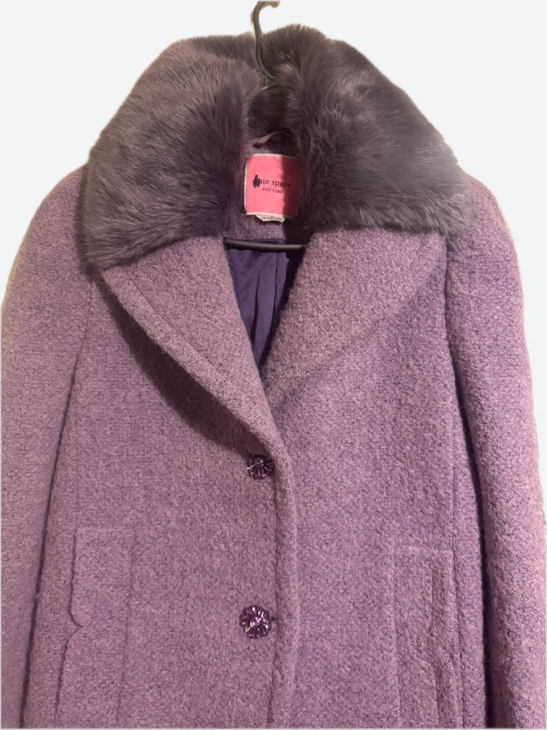 Chic Kate Spade New York wool blend coat in a lovely purple hue. It features a detachable faux fur collar and stylish button closures. This elegant coat is perfect for staying warm and fashionable during cooler weather.