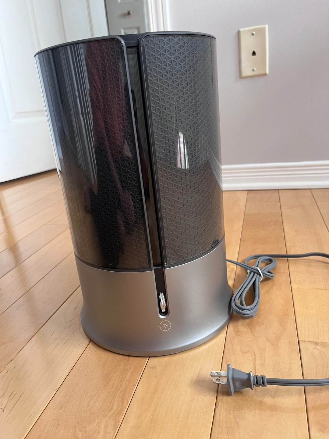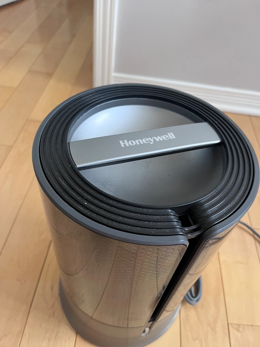 This Honeywell air purifier features a sleek, modern design. It's perfect for improving air quality in your home. The unit is cylindrical and comes with a power cord.