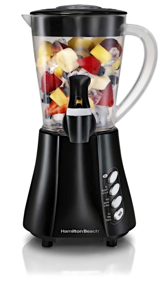 This Hamilton Beach blender has multiple settings including mix, puree, and crush ice. It's great for making smoothies and milkshakes. The pitcher is clear plastic with measurement markings.