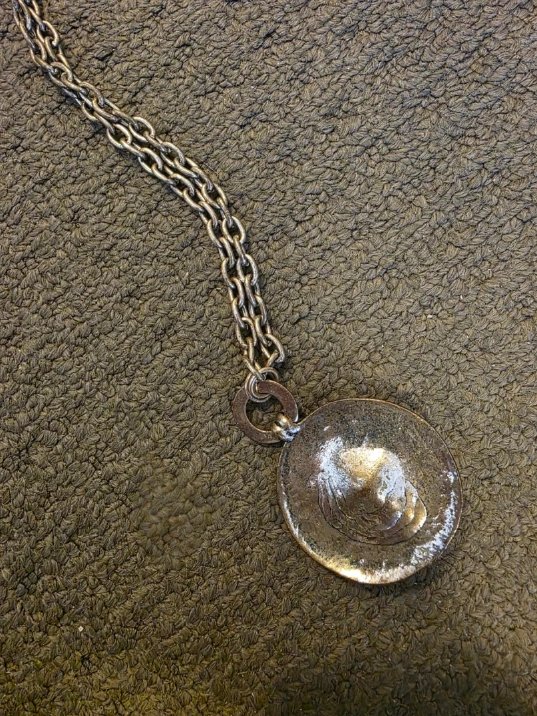 Silver tone necklace with a round pendant featuring a purple/red gemstone. The chain is long and has a substantial link design. A nice accessory for any outfit!