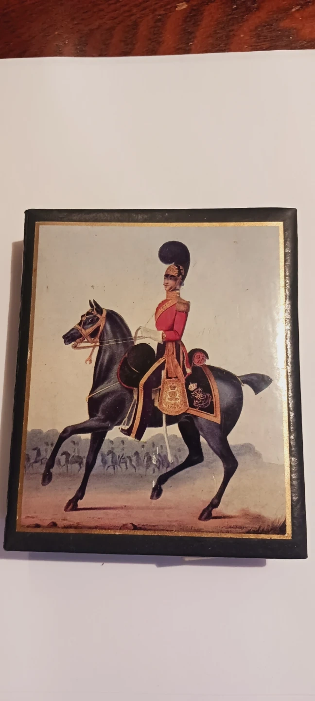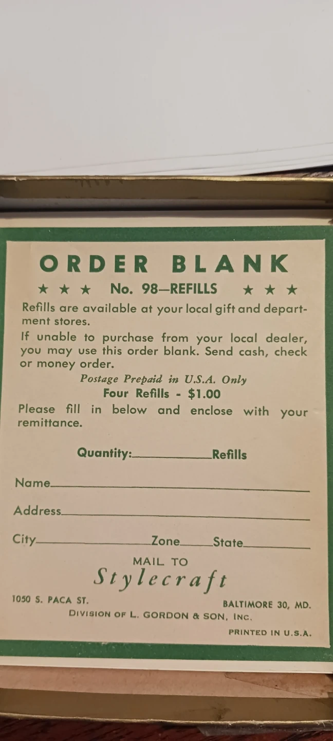 Beautiful Antique Collectible Decorative Box for holding blank paper notes. This is an original Stylecraft order blank for refills, no. 98. It's from Division of L. Gordon & Son, Inc. in Baltimore, MD. The order blank states refills were available for $1.00 for four refills. The exterior of the box has an image of a soldier on horseback. Excellent condition. 5"×4". ALL MY PRICES ARE NEGOTIABLE !!