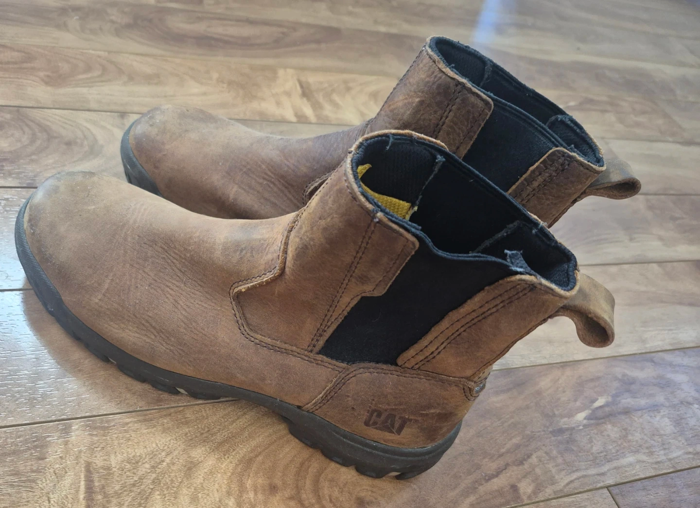 Selling a pair of CAT steel toe work boots in brown leather. They are in used condition, as you can see from the soles, but still have lots of life left. Size 9 US.