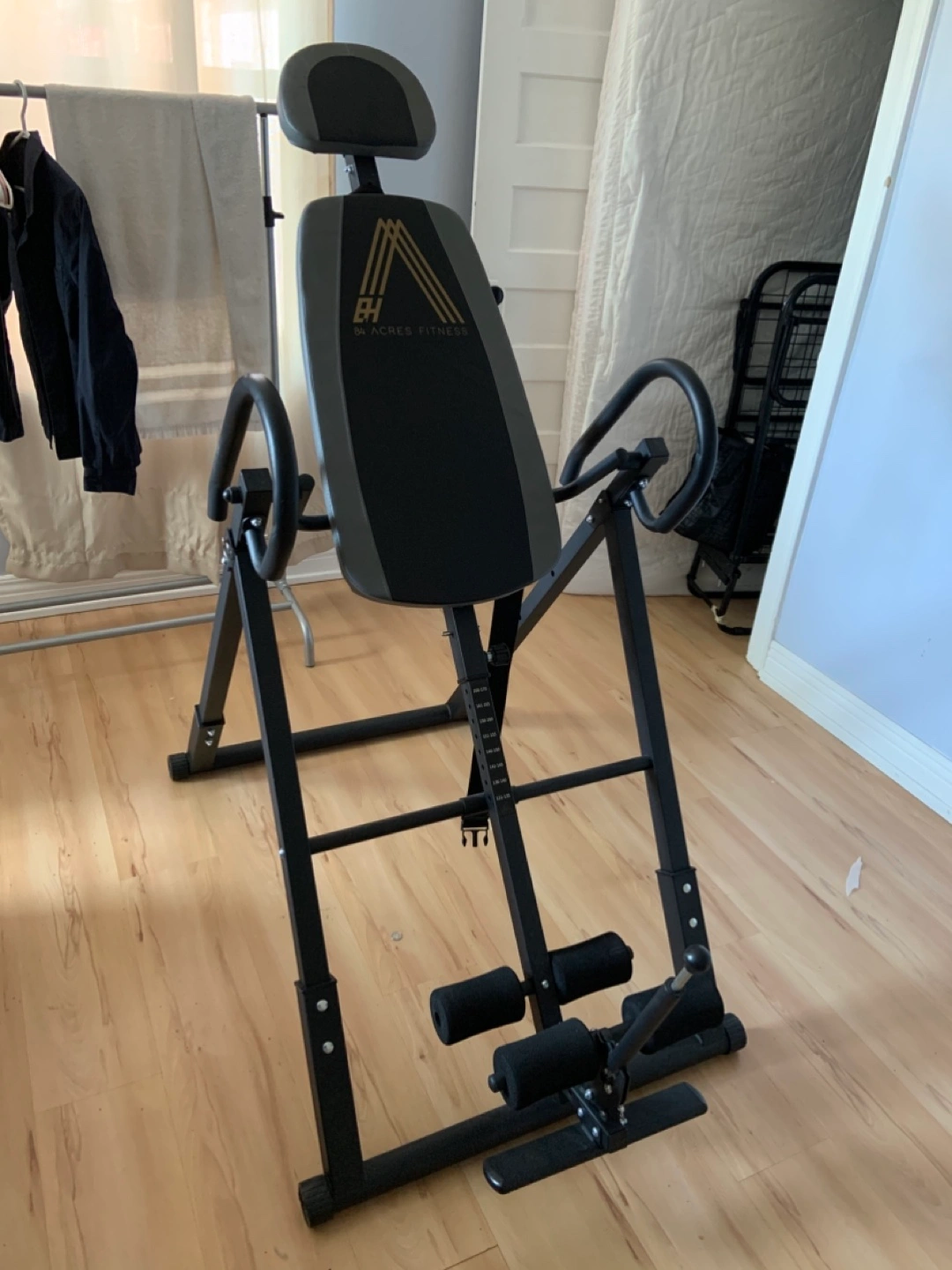 Inversion table, black frame, grey cushioned backrest. Adjustable height. Footrests included. Good for stretching and back relief.