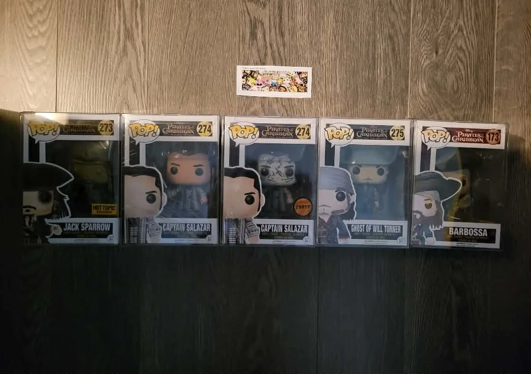 Collection of five Funko Pop! figures from Pirates of the Caribbean. Includes Jack Sparrow (273), two Captain Salazar figures (274), Ghost of Will Turner (275), and Barbossa (173). All figures are in their original boxes.