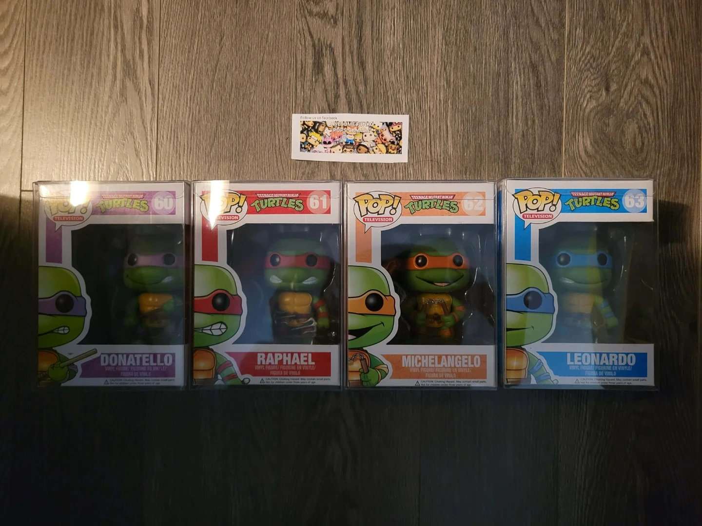 Set of four Funko Pop! vinyl figures featuring Donatello, Raphael, Michelangelo, and Leonardo from Teenage Mutant Ninja Turtles. Figures come in their original boxes.