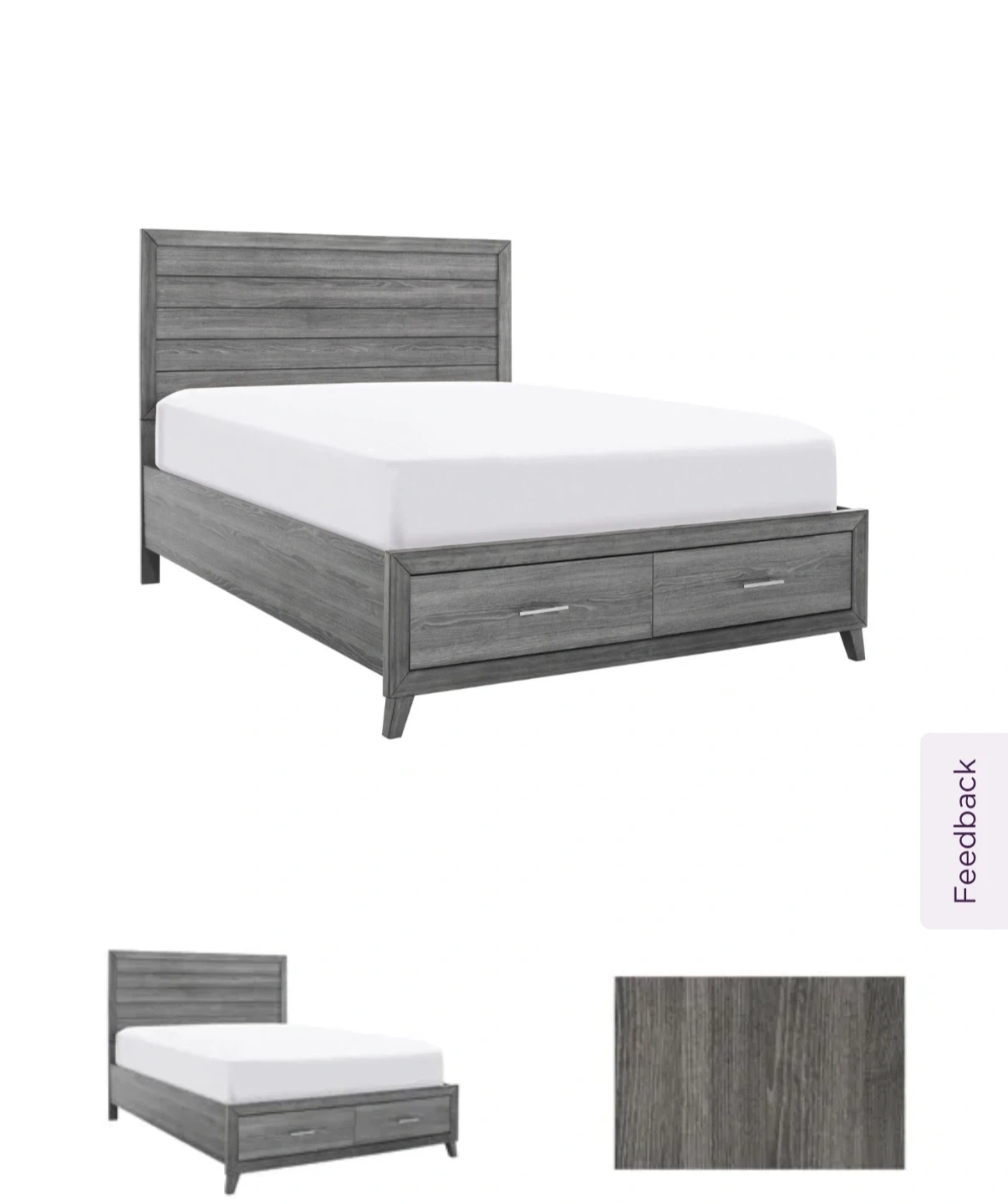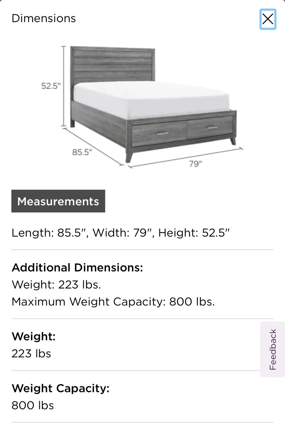 This king bed frame has a gray wood finish and two storage drawers at the foot. Its dimensions are 85.5" L x 79" W x 52.5" H. It supports up to 800 lbs.