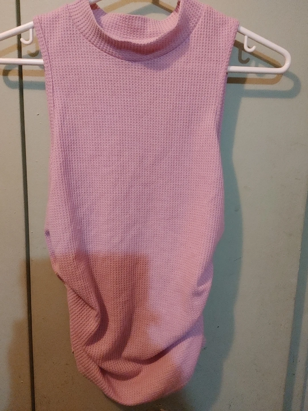 This is a SHEIN sleeveless mock neck top in a pretty pink colour. It's a size Large with a waffle knit texture. It's made from a soft fabric that feels comfy to wear!