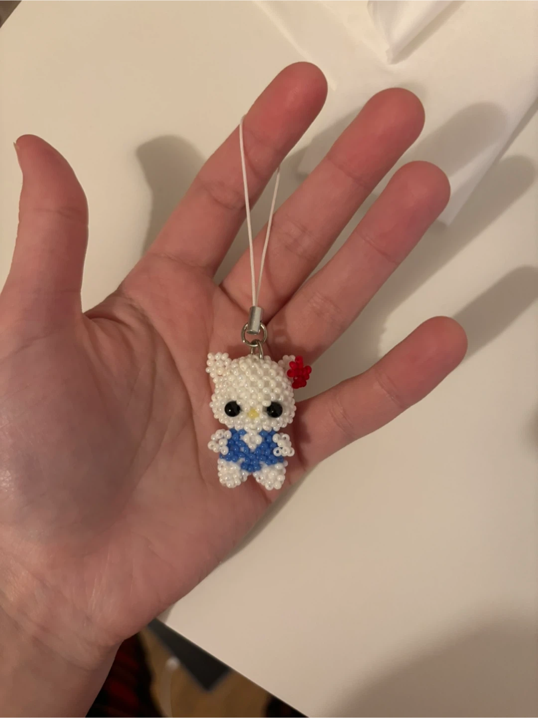 This is a cute beaded charm of Hello Kitty. It's made from small white and blue beads with a red bow. It has a white strap for hanging.