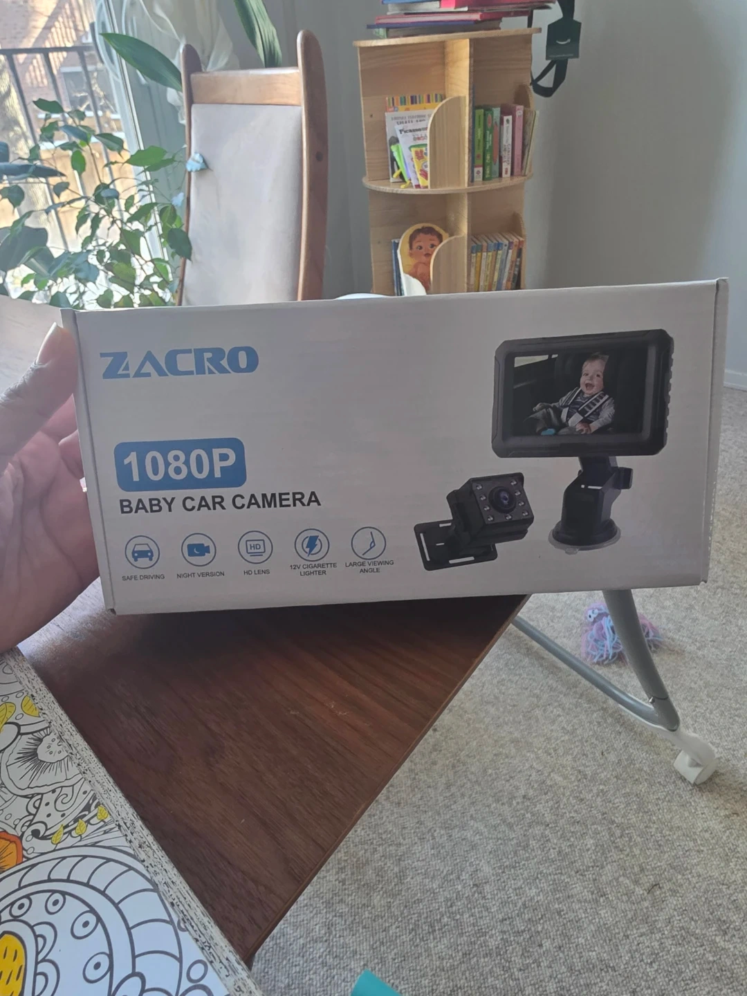 This is a ZACRO 1080P baby car camera. It has a HD lens and a wide viewing angle. The camera powers via a 12V cigarette lighter adapter. This camera is useful for keeping an eye on your little one while driving!