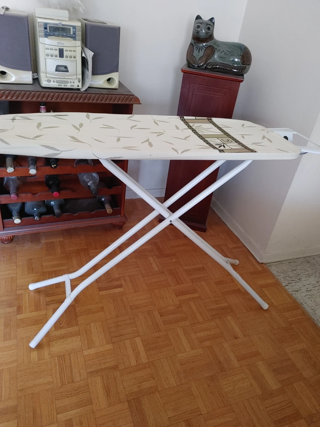 A sturdy white metal ironing board with a decorative leaf pattern cover. It's designed with a foldable frame for easy storage. Includes a built-in accessory tray.