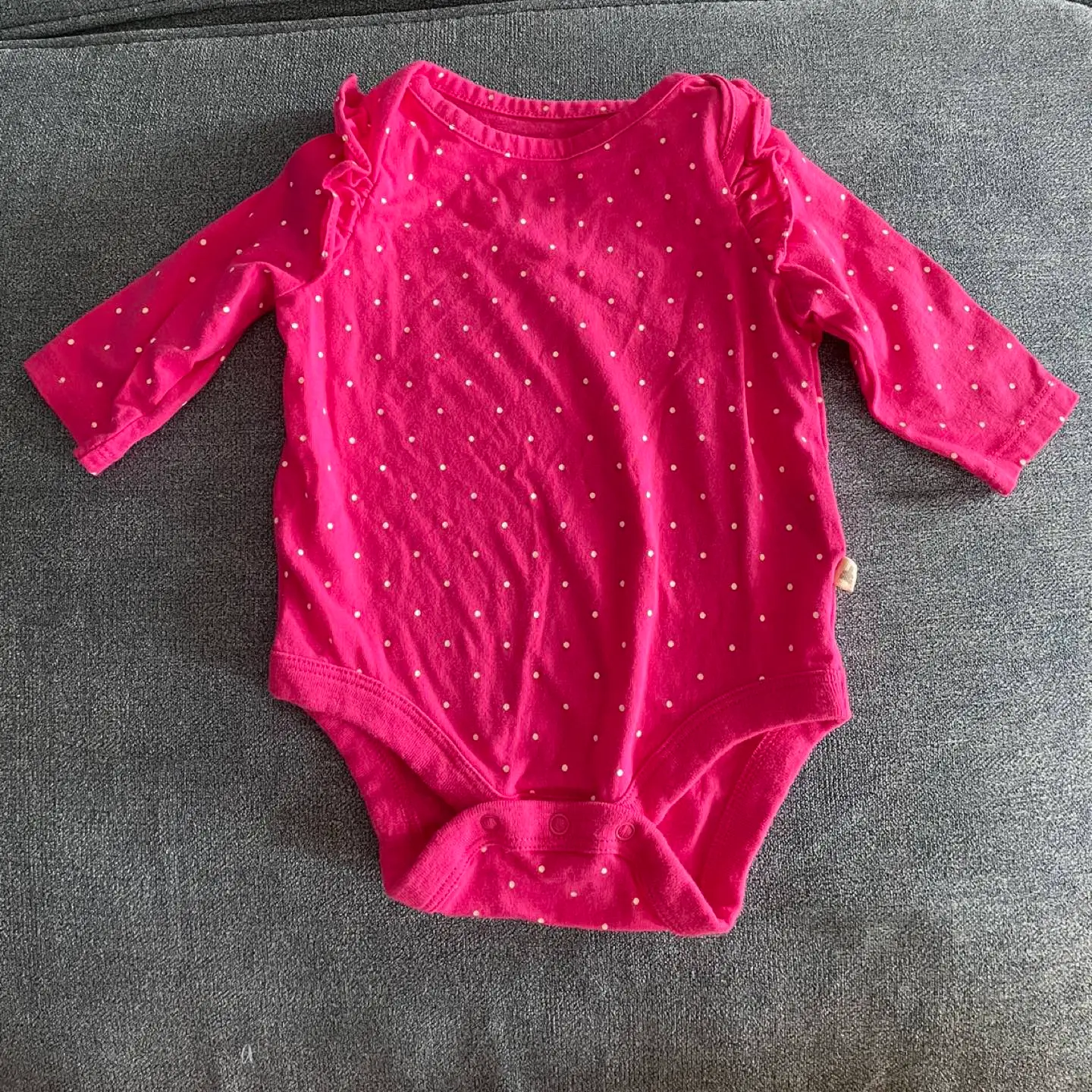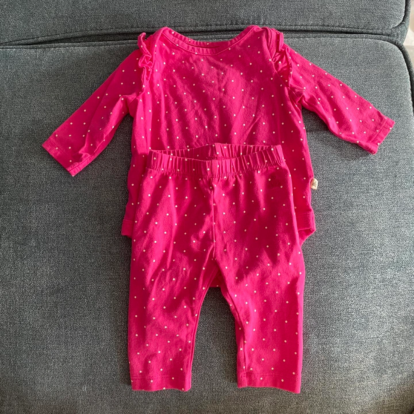 Pink long sleeve onesie with ruffles at shoulders and leggings