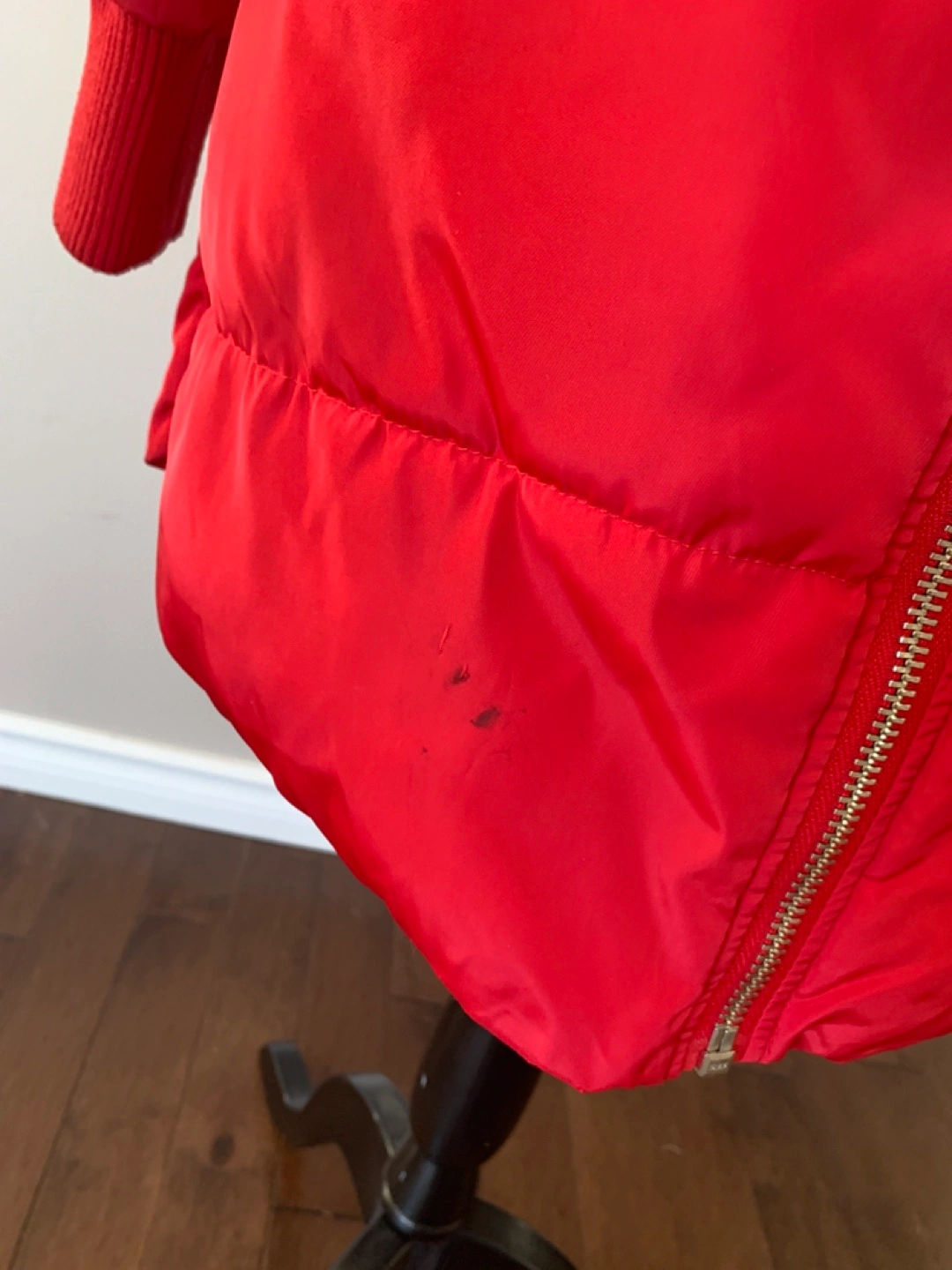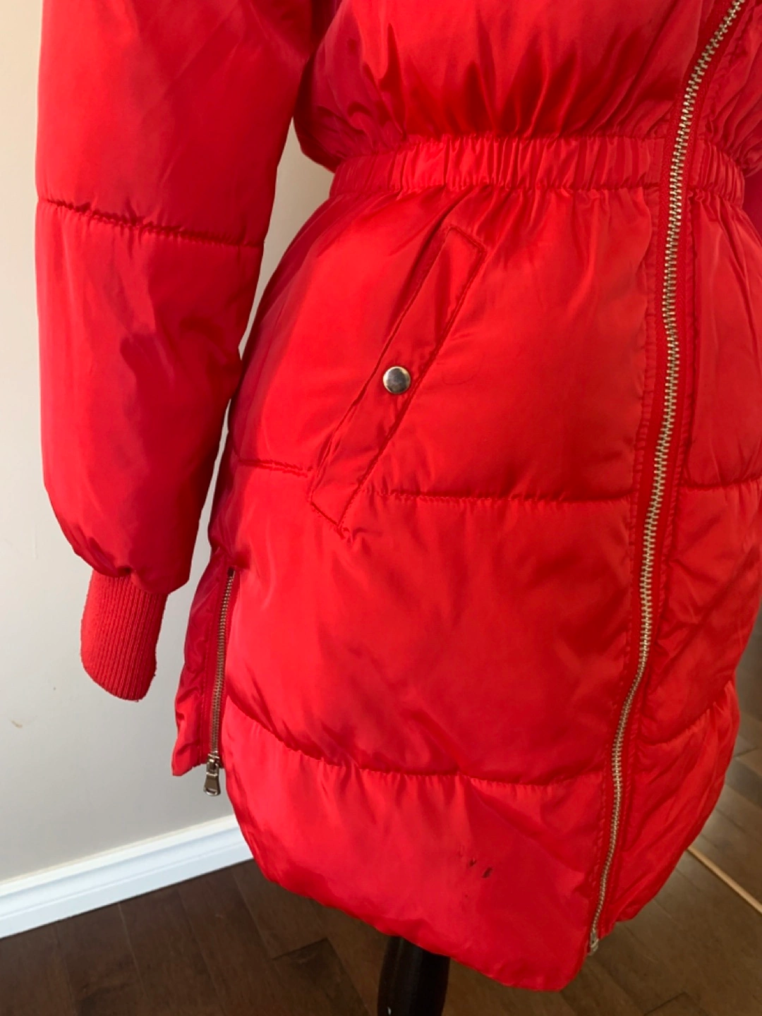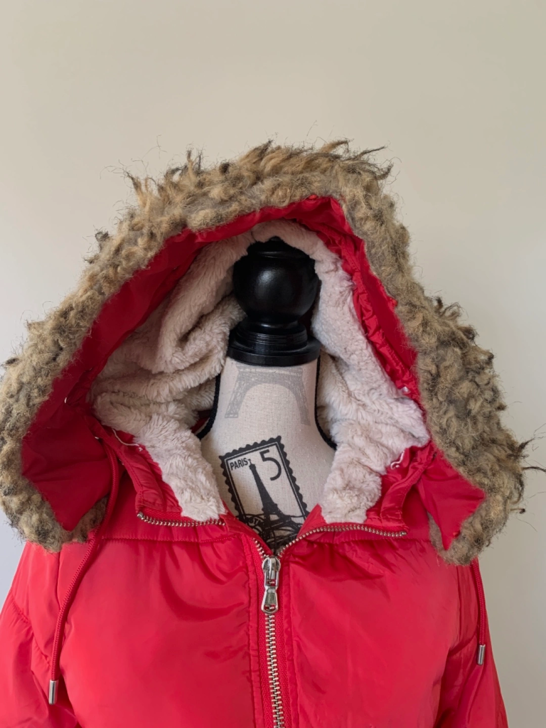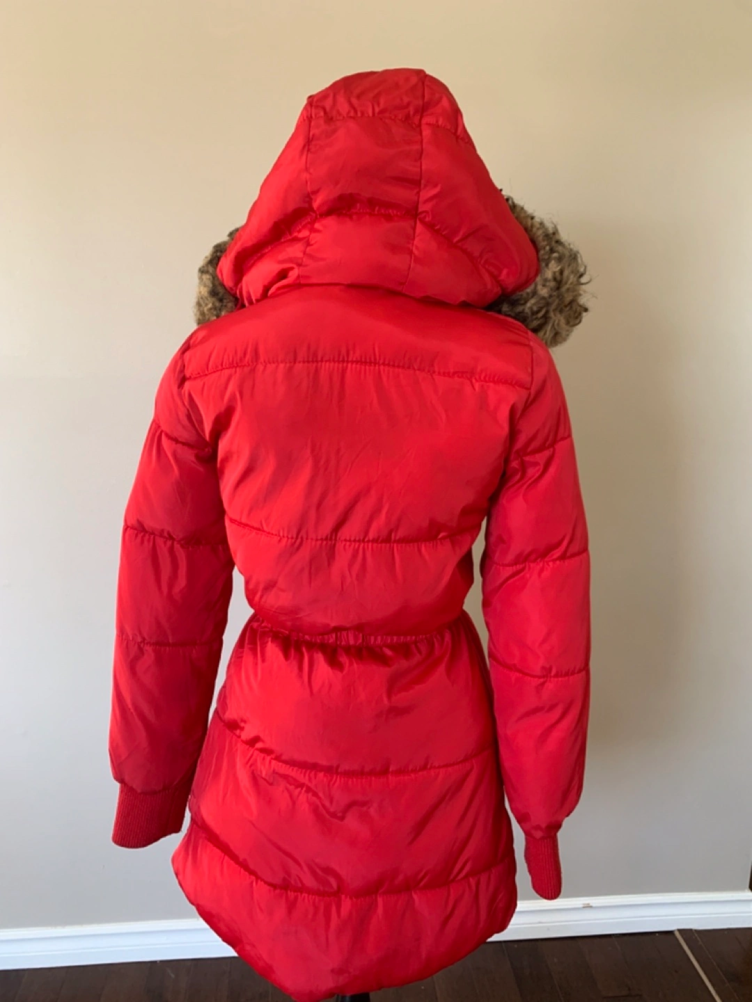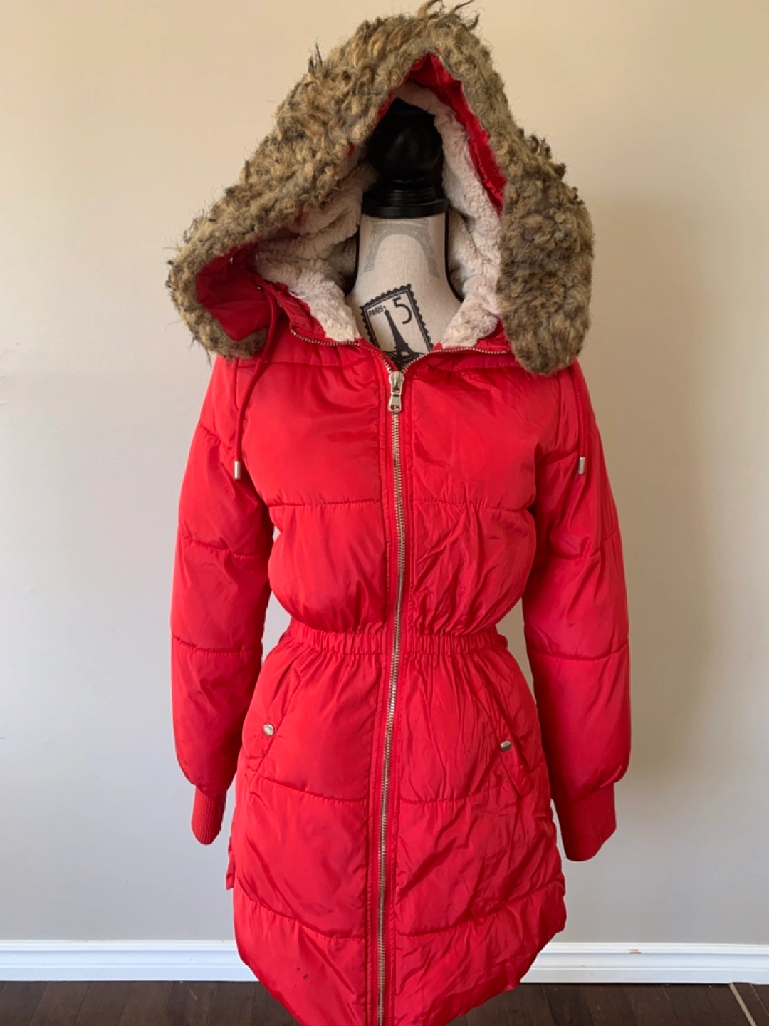 Red puffer jacket with faux fur hood and a drawstring waist. Features a zipper closure and two pockets.