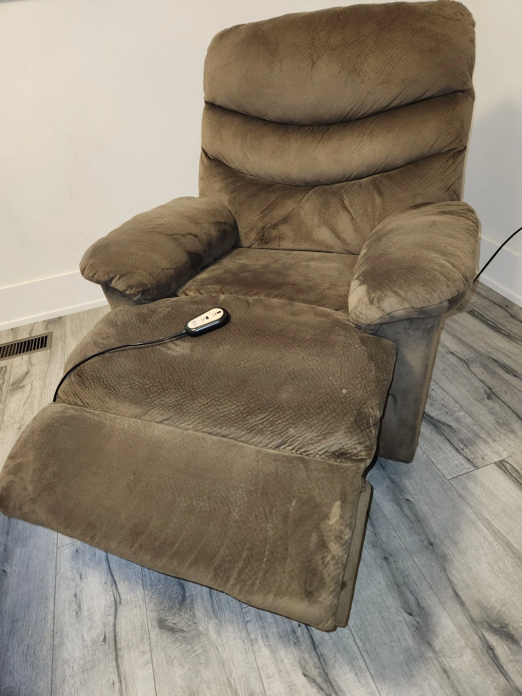 The infinite position power lift chair transitions between reclining, sitting, and lifting and can stop at any position in between with the easy-to-use wire attached remote controller. Sturdy structure, hand powered remote, side pocket, suede material. ideal TV watchin' chair, napping chair. It is very comfortable and also in perfect condition. Smoke and pet- free home. Available for pickup near Martin Grove and Westway. Welcome to see my other listings.