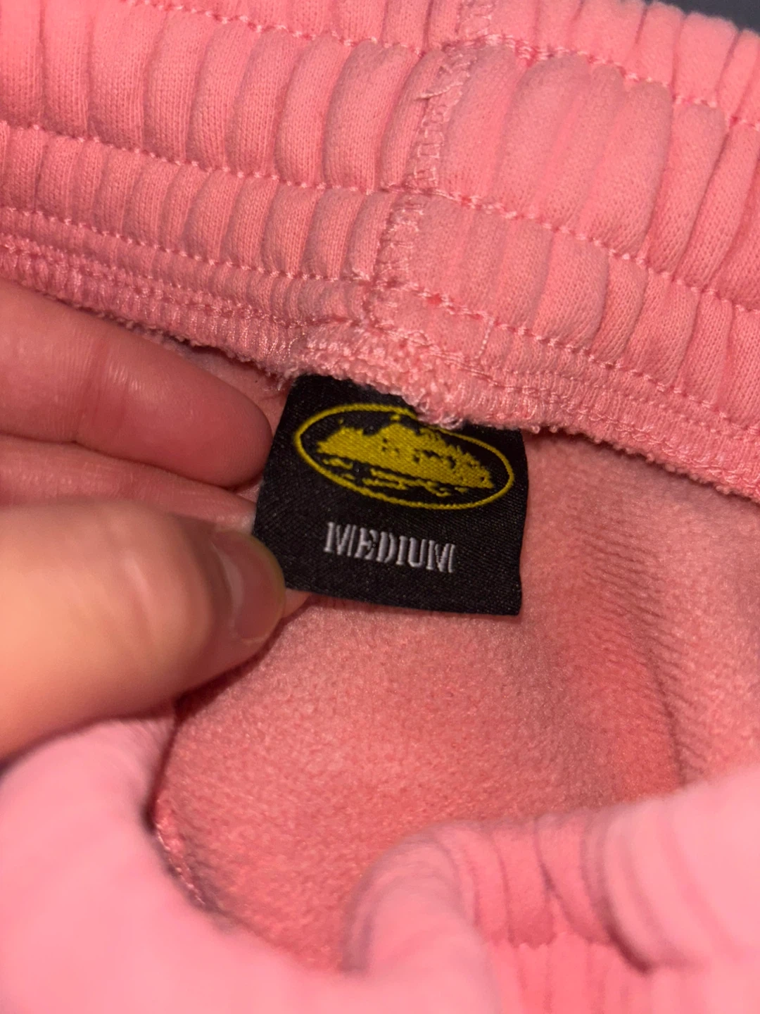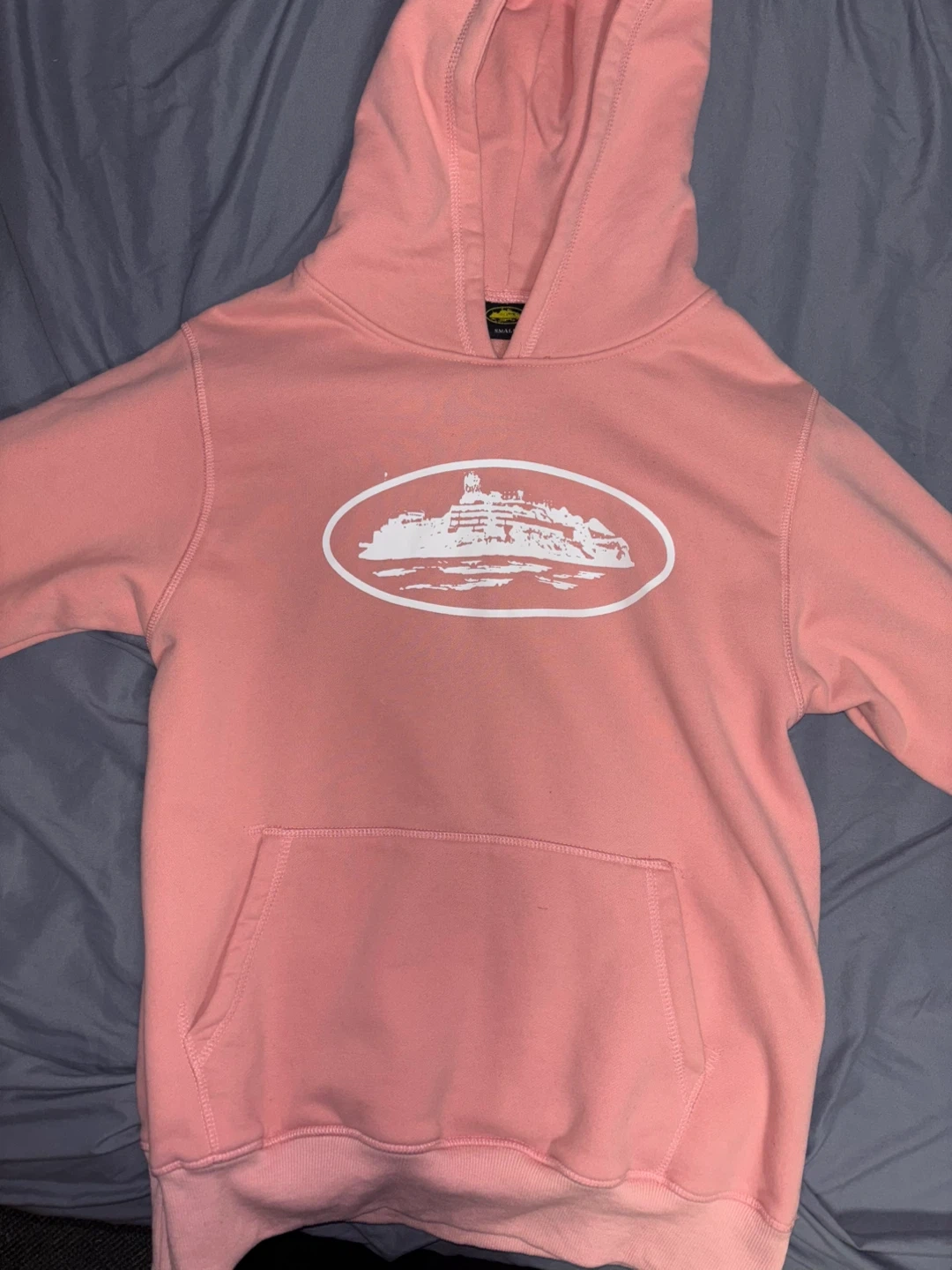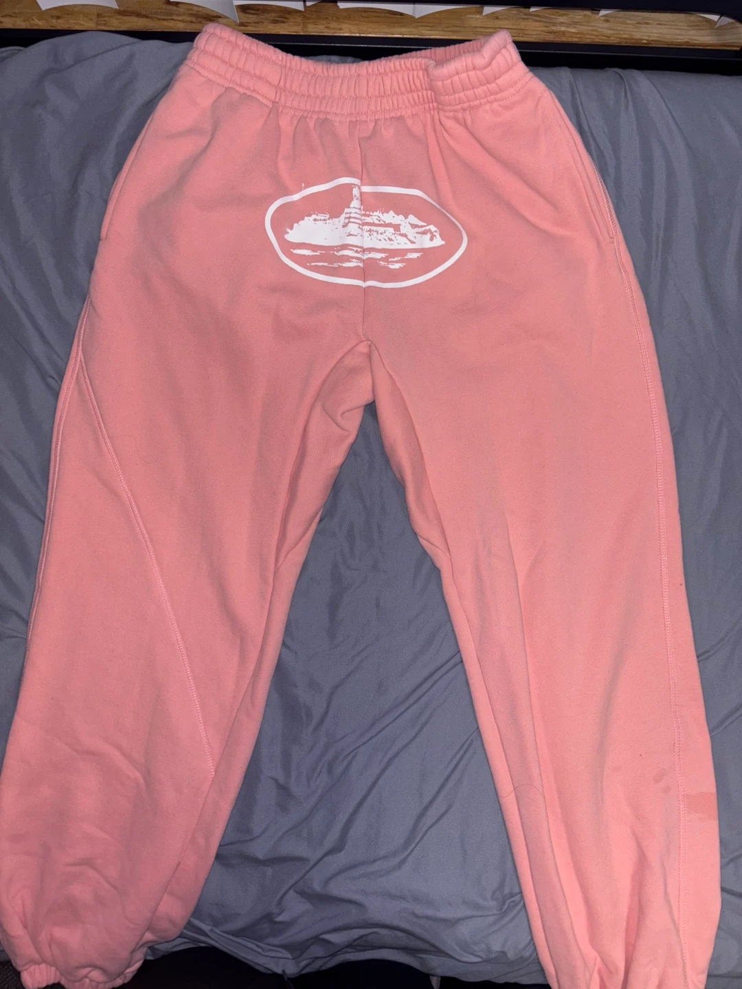 This is a pink hoodie and sweatpants set. The hoodie is size small and the sweatpants are size medium. Both pieces have a white graphic of a building within an oval.