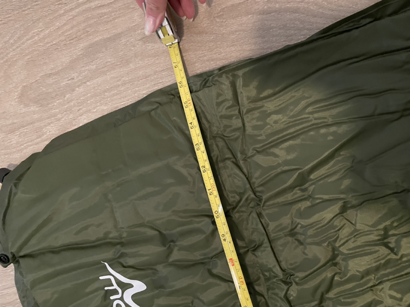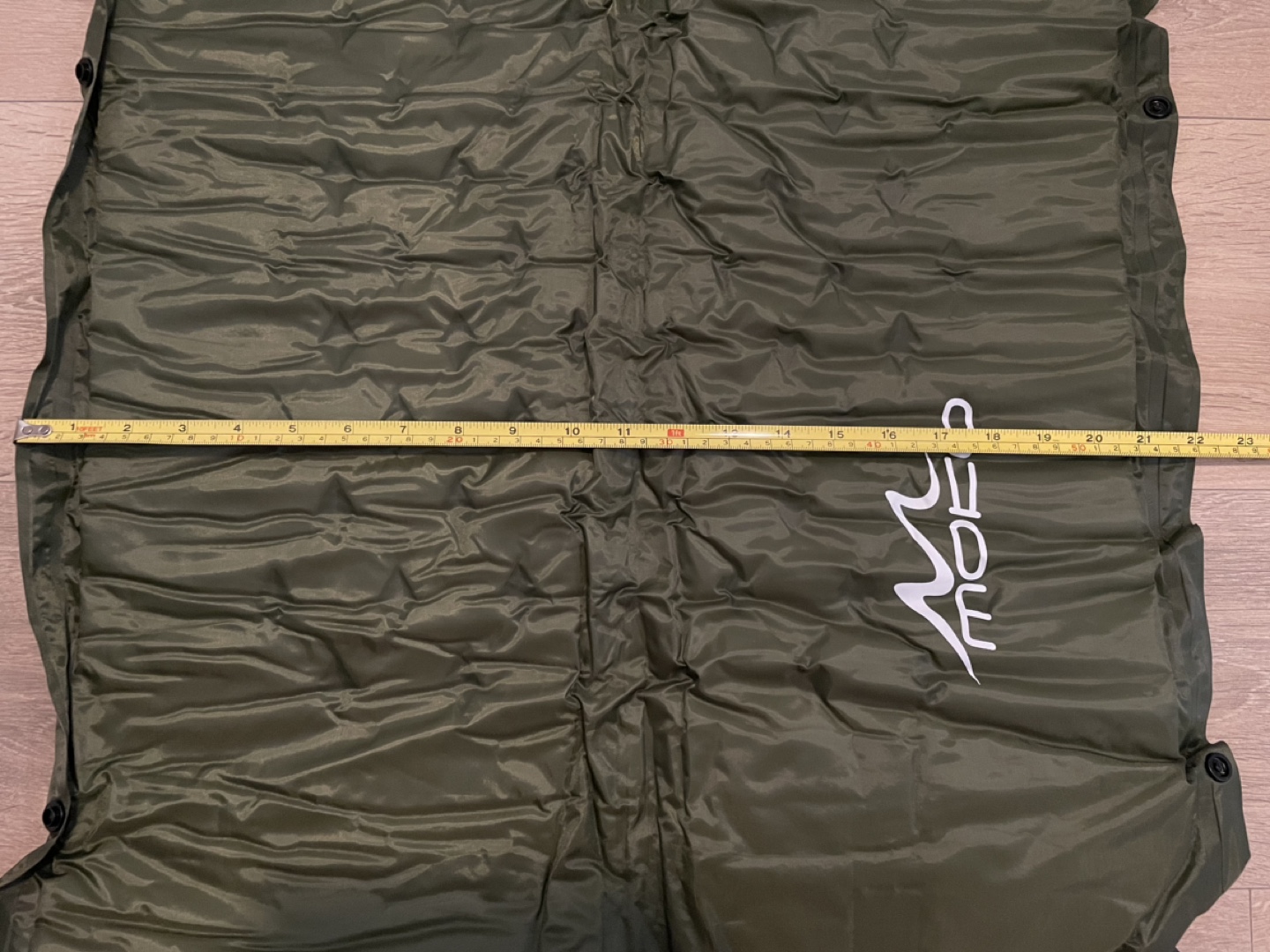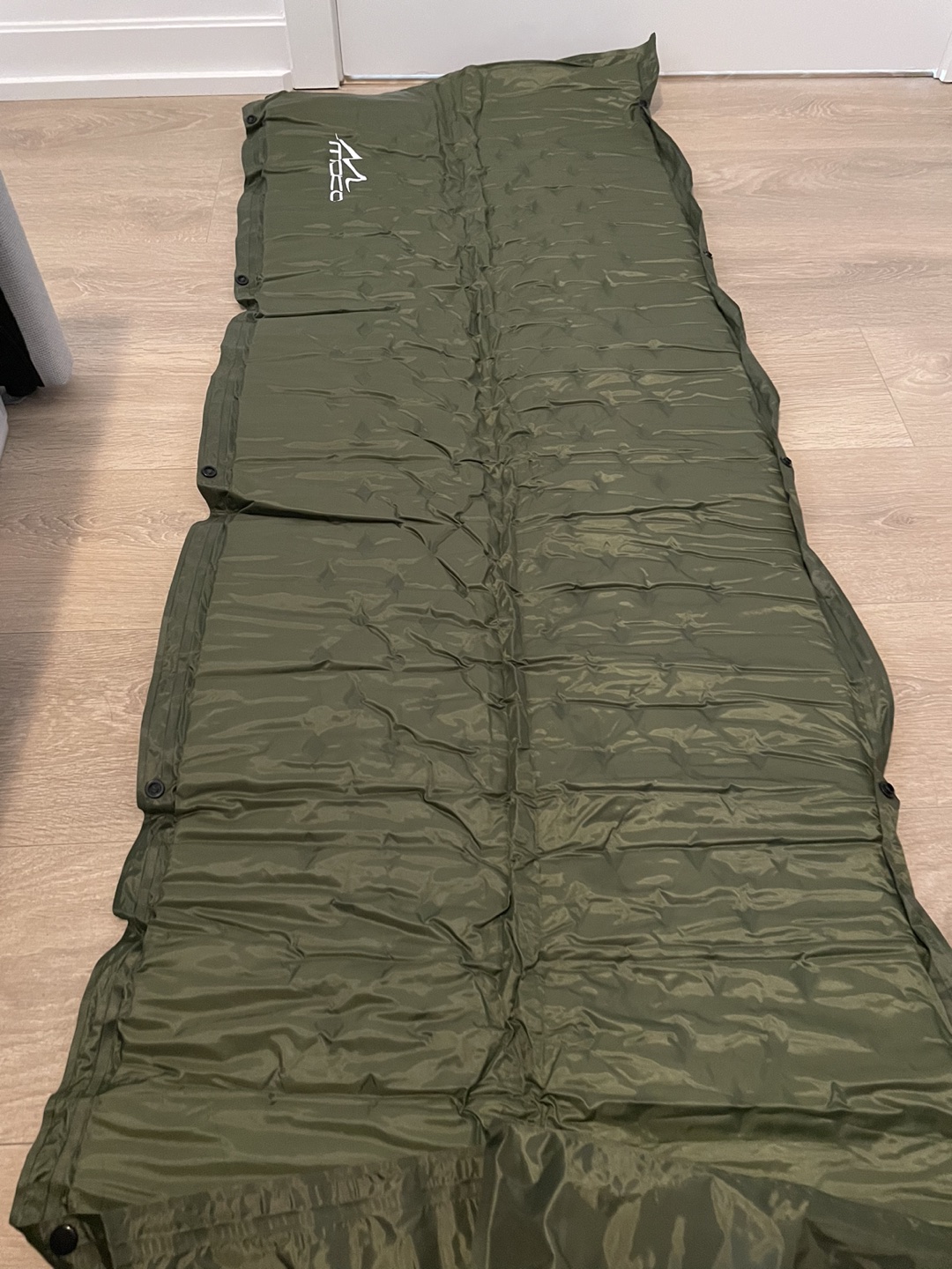 419Used this one time only Self inflating camping mat, also has a pillow attached to it that you manually inflate Single person sleeping mat Dimensions: roughly 21 by 55 Inches