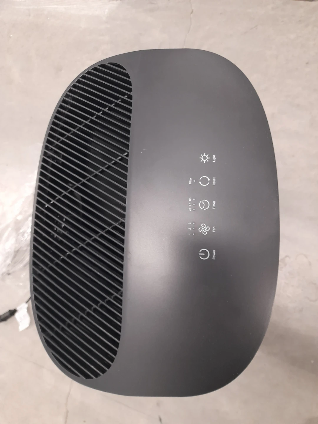 This Filtrete air purifier comes in a dark grey colour. It has multiple settings including fan speed and timer. It's a compact unit with a sleek design.