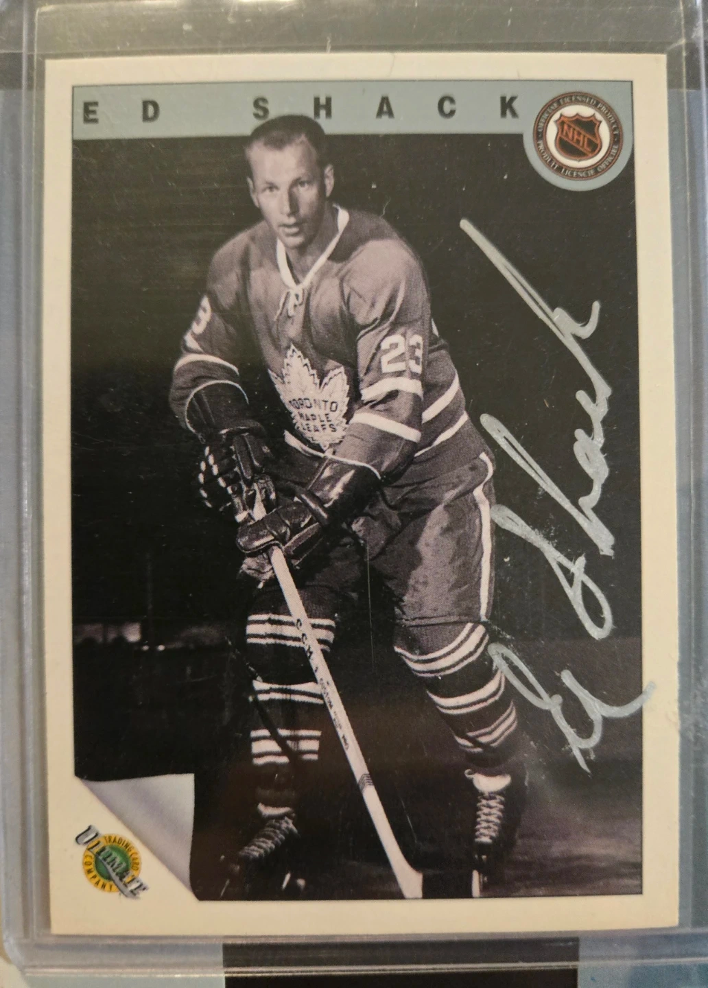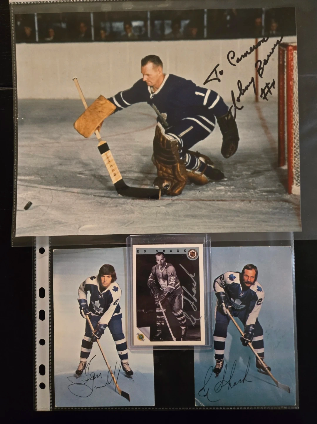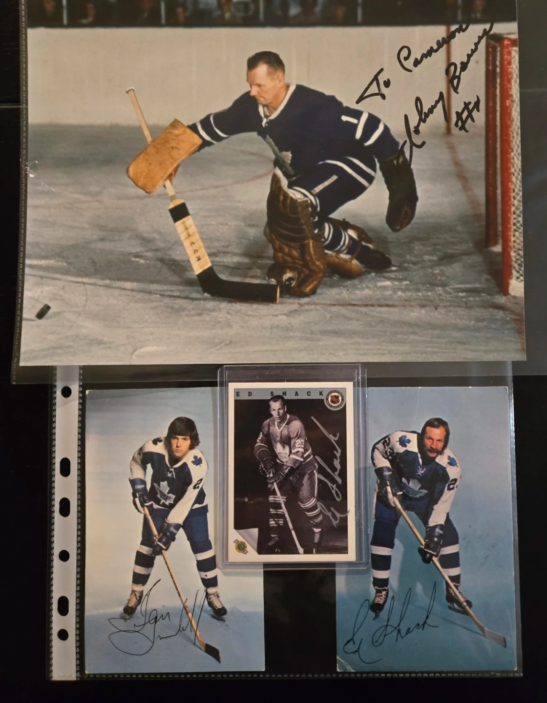 This lot includes an Official Autographed photo of Johnny Bower in net and two signed 1973 promo. photos featuring Ed Shack and Ian Turnbull. Also includes an Autographed Ed Shack Classic hockey card. These items showcase former Toronto Maple Leafs players.