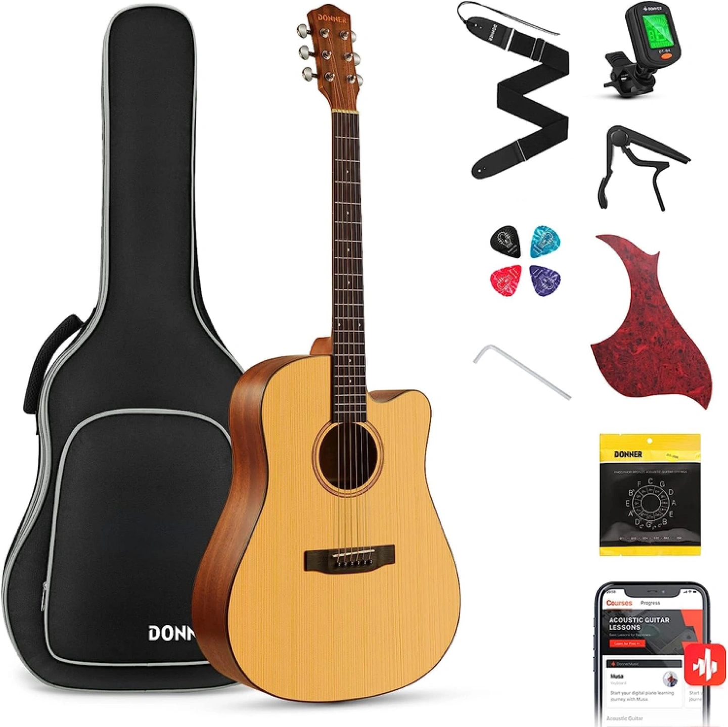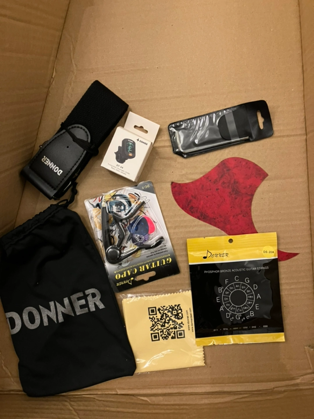 Selling a brand new Donner Adult Beginner Guitar. Full size 41' inch, Never used. Acoustic with a full started bundle kit including Gig Bag Strap Tuner Capo Pickguard String Picks Cloth.