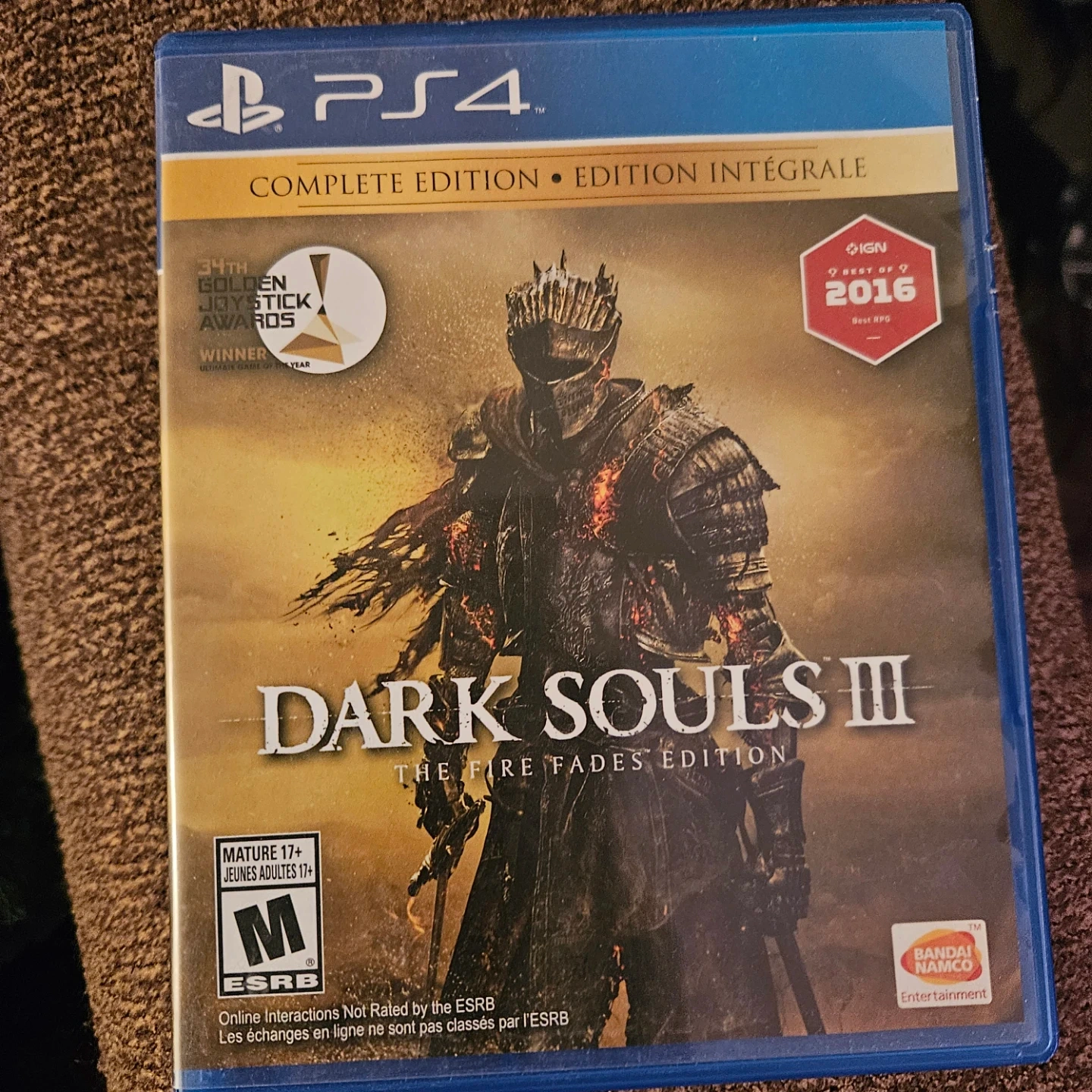 This is the Complete Edition of Dark Souls III, also known as The Fire Fades Edition. It's rated M for Mature 17+ by the ESRB. The game won Best RPG from IGN in 2016 and was awarded Ultimate Game of the Year by the Golden Joystick Awards.