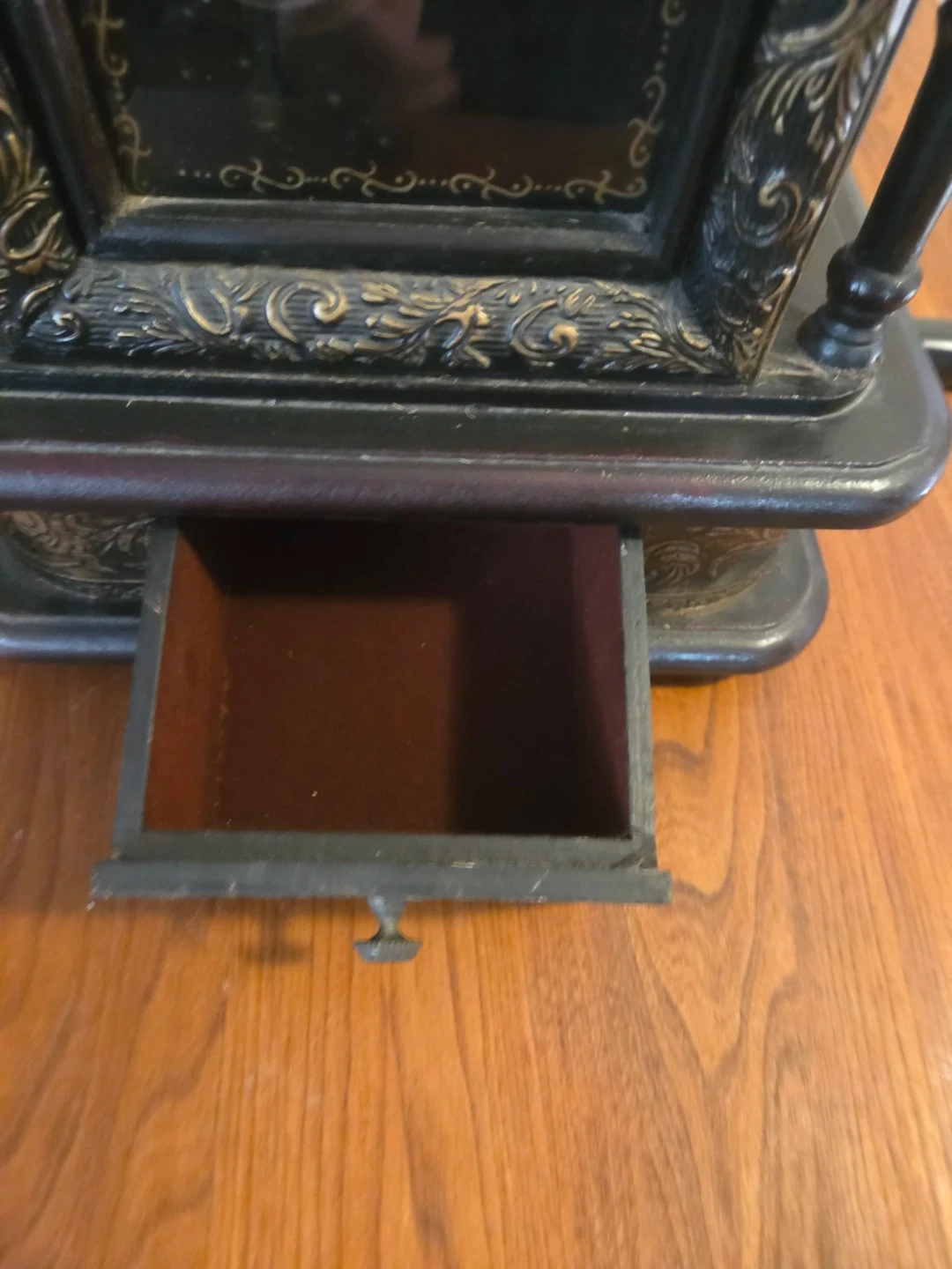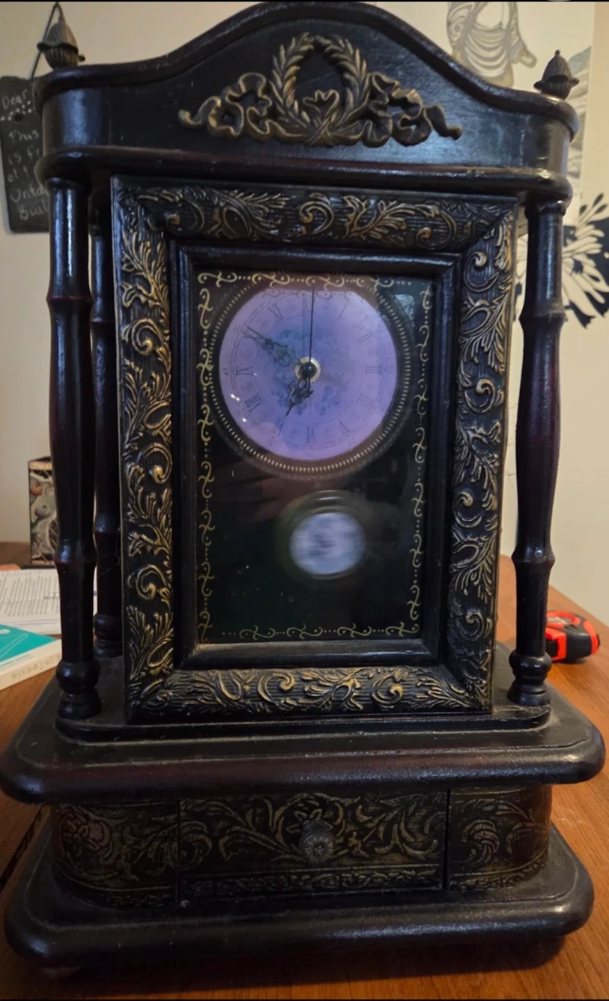 Contains a working pendulum, built-in storage drawer in base. And yes, it does make the classic ticking sound.