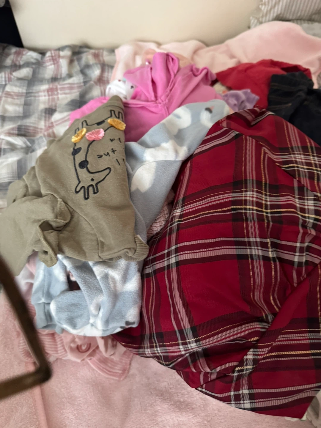 clothes including a khaki green long-sleeve shirt with a dinosaur graphic. Includes various sizes and styles suitable for infants .Fabric types include cotton and fleece.
