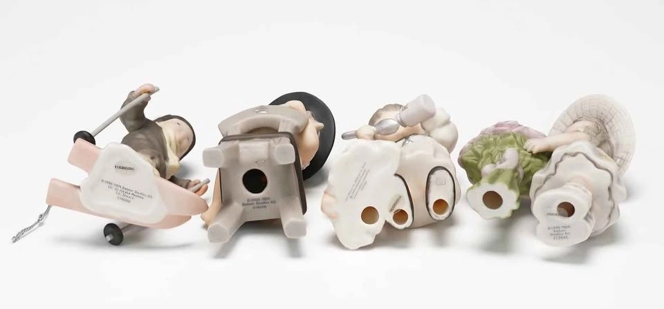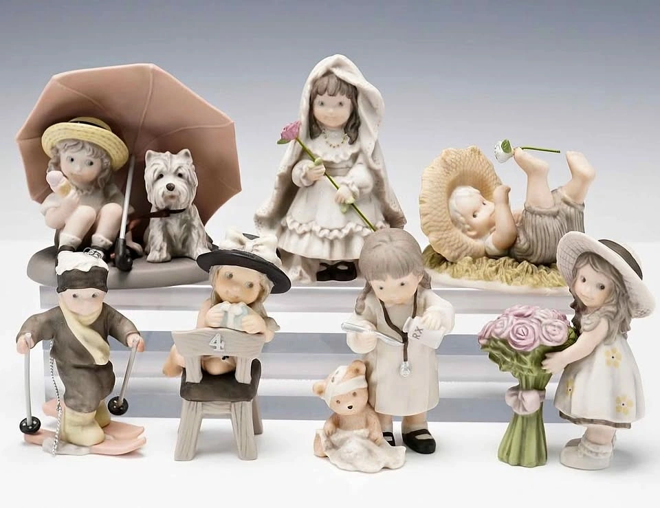 These figures depict children engaged in imaginative play, like a young doctor with a teddy bear, a skier, and a student at a desk. Other pieces show sweet moments with bouquets, umbrellas, and children playing.