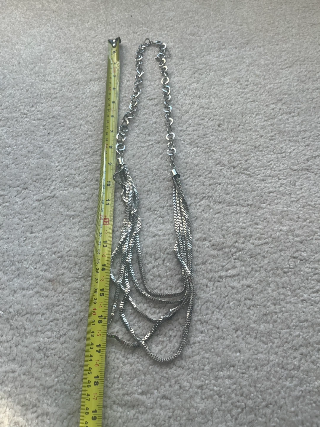 A stylish silver necklace featuring multiple delicate strands that cascade together. This piece adds a touch of elegance to any outfit. It's a great accessory for both casual and formal occasions!
