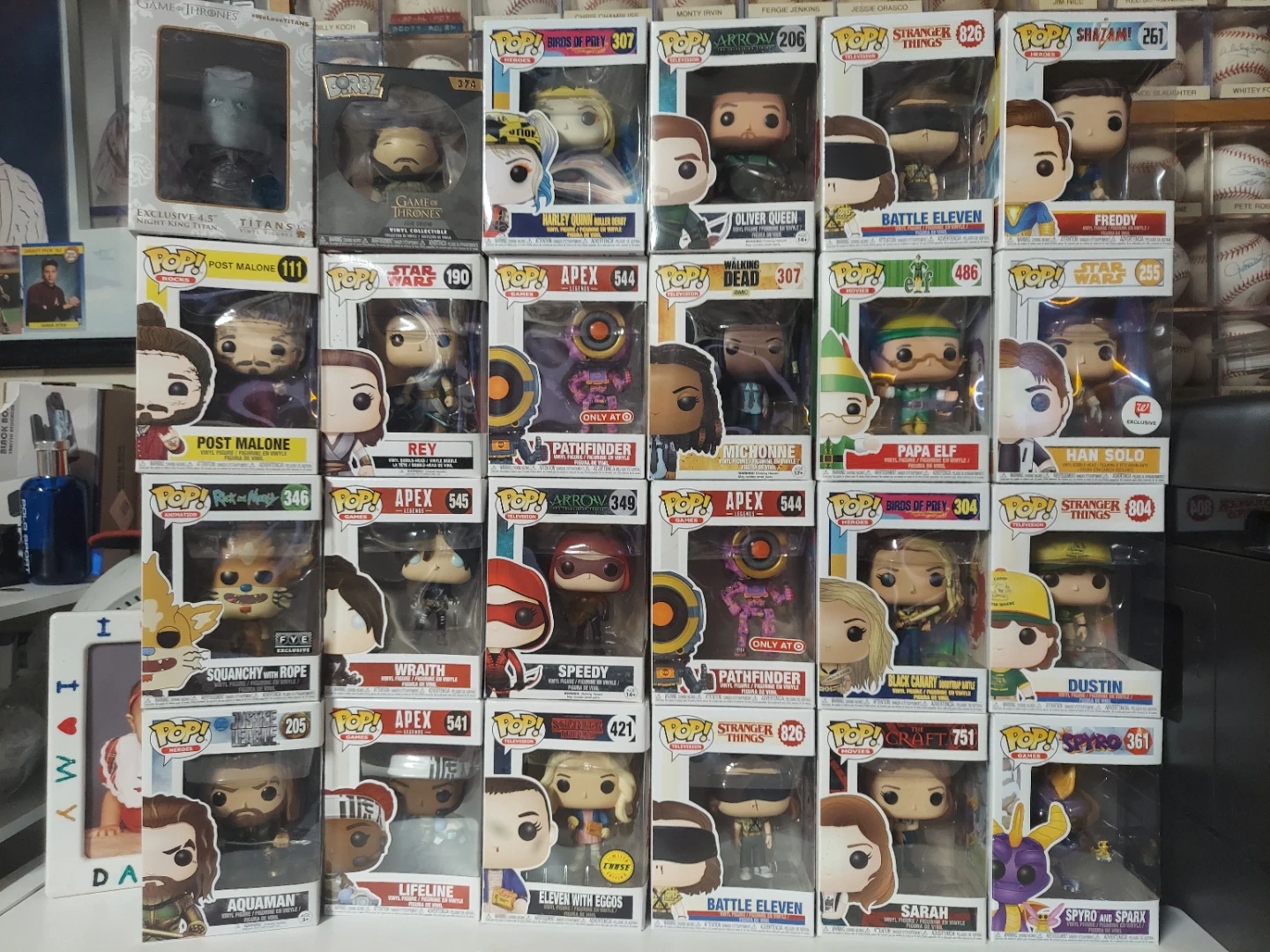 Assorted Funko Pop! vinyl figures from various popular franchises. Collectible items showcasing characters like Rey, Eleven, and more. These figures are great for display and collecting! Asking. 10$ each...you pick which one you want.only 10$ each