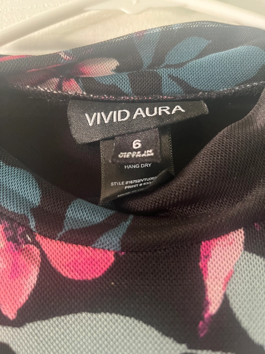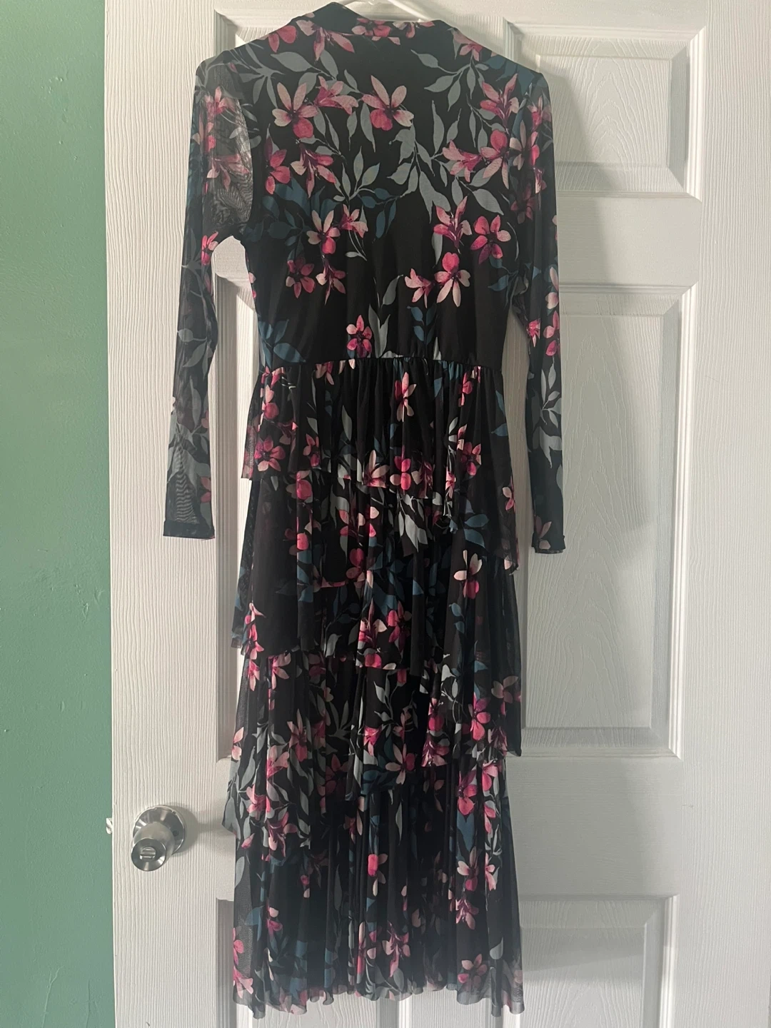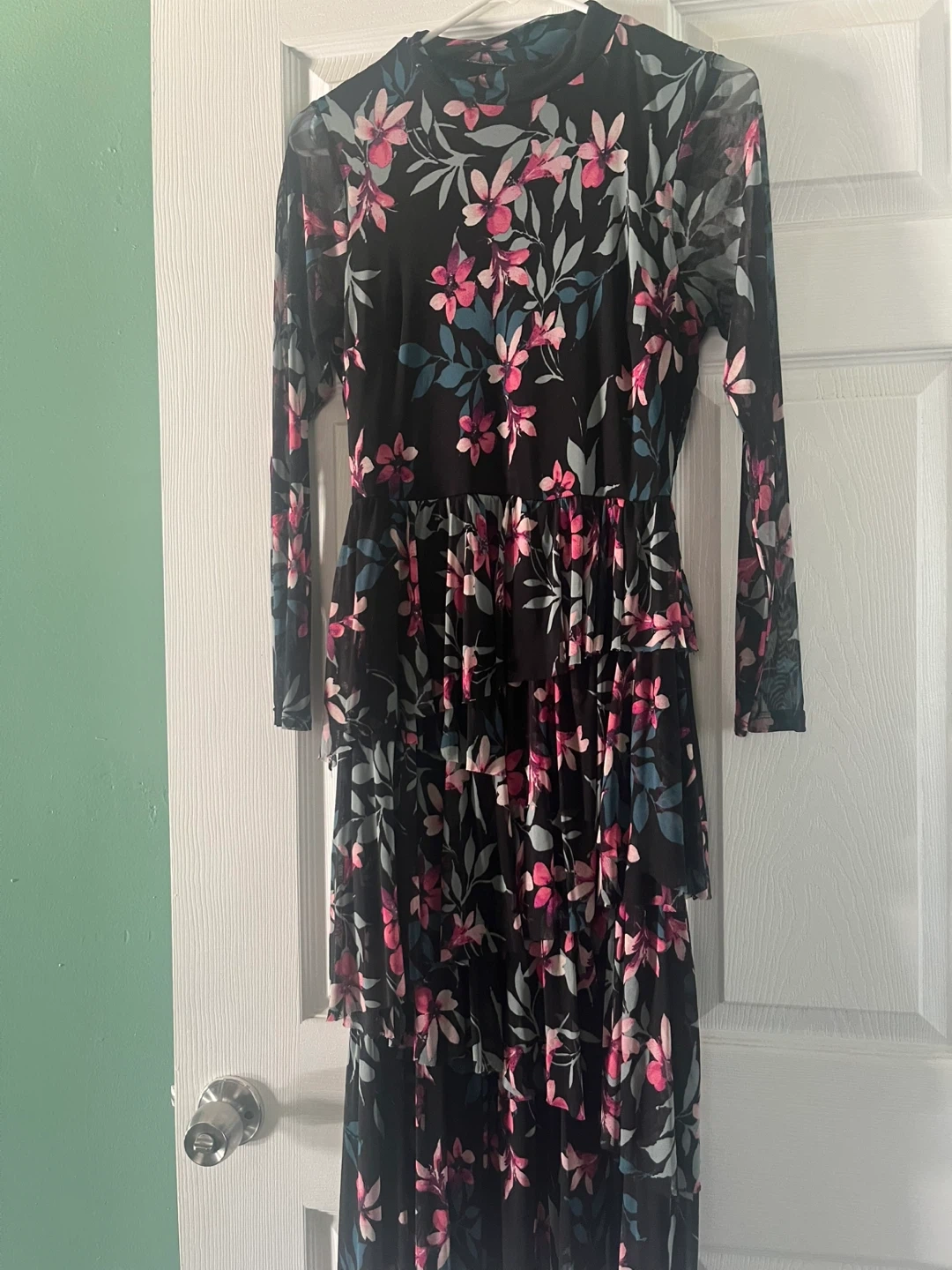 This Vivid Aura dress features a black mesh overlay with a vibrant floral print. It's designed with long sleeves and tiered ruffles down the skirt. Size is 6.