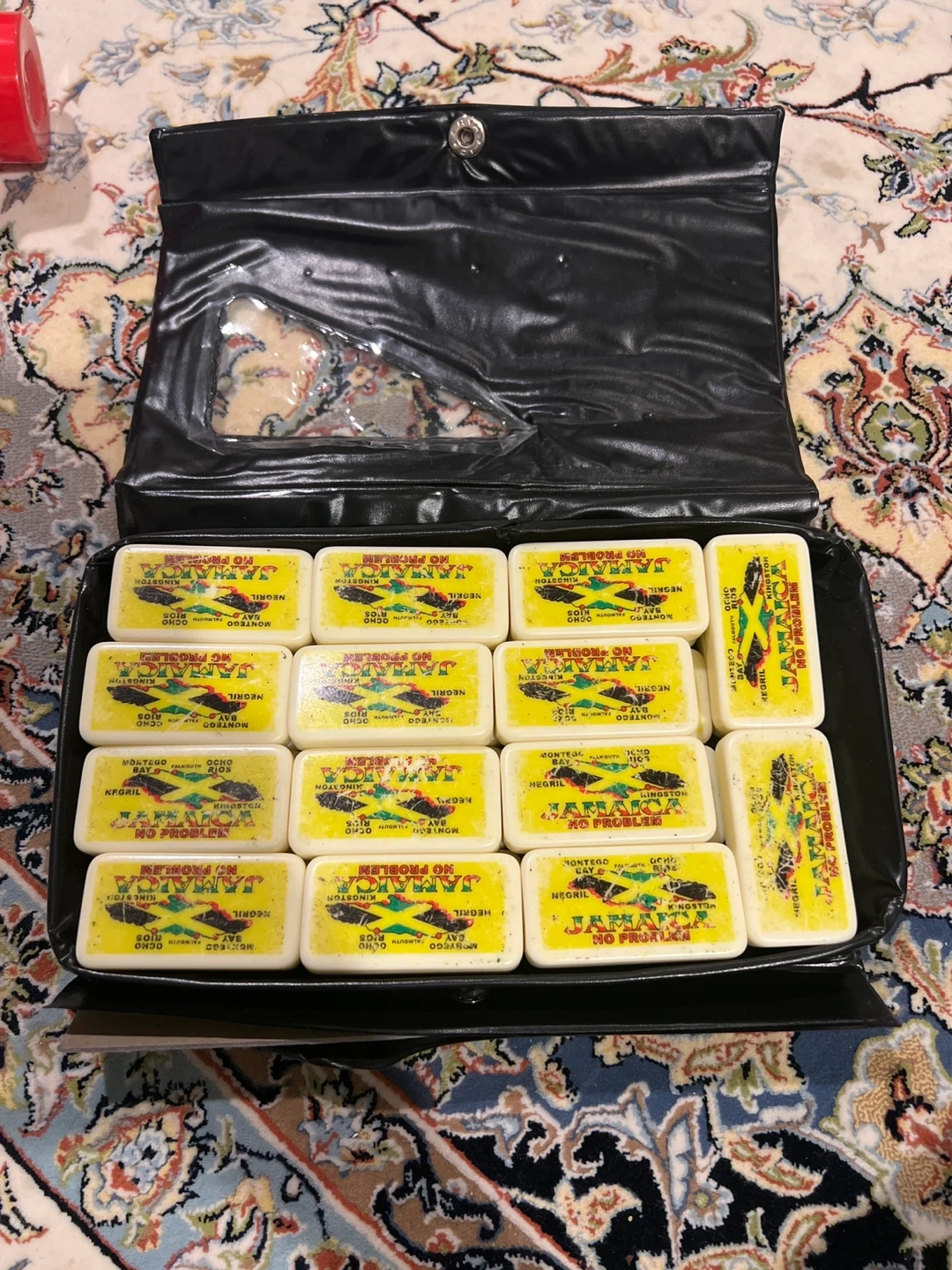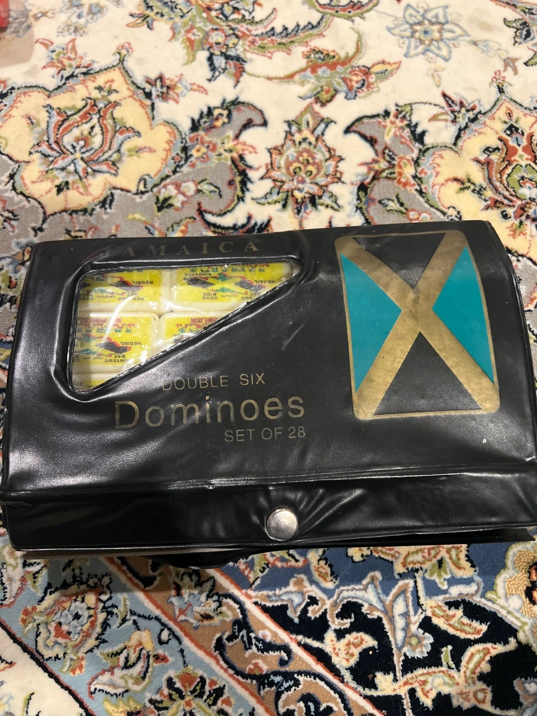 This is a set of Double Six Dominoes, featuring a Jamaica theme. It includes 28 dominoes and comes in a black case. The case has a clear window to see the dominoes inside.