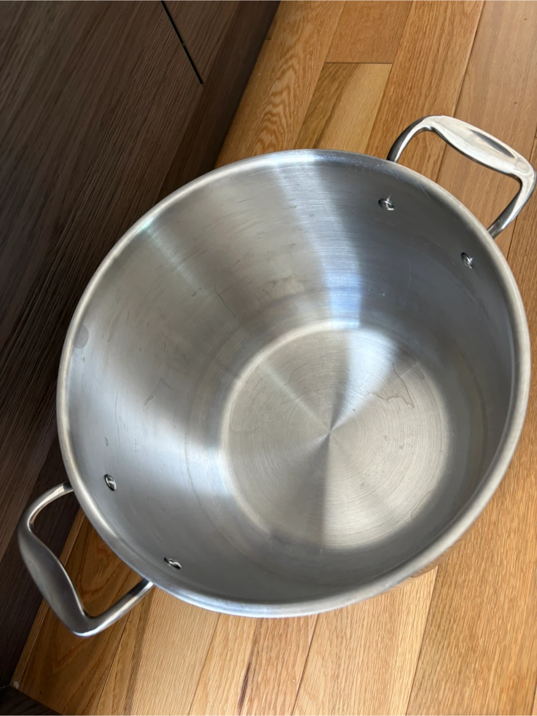 A large stainless steel stock pot with measurement markings inside (15.1L)