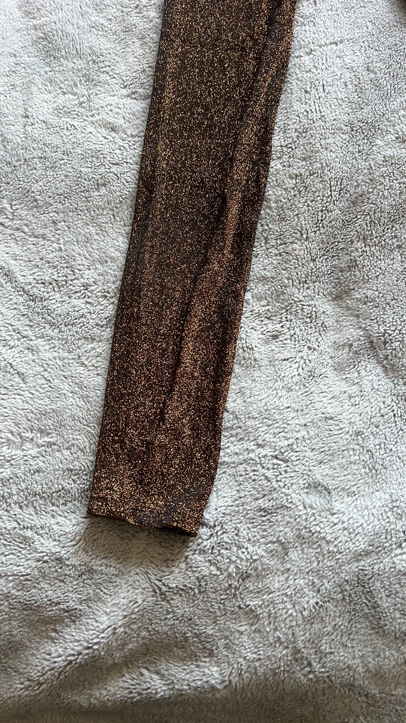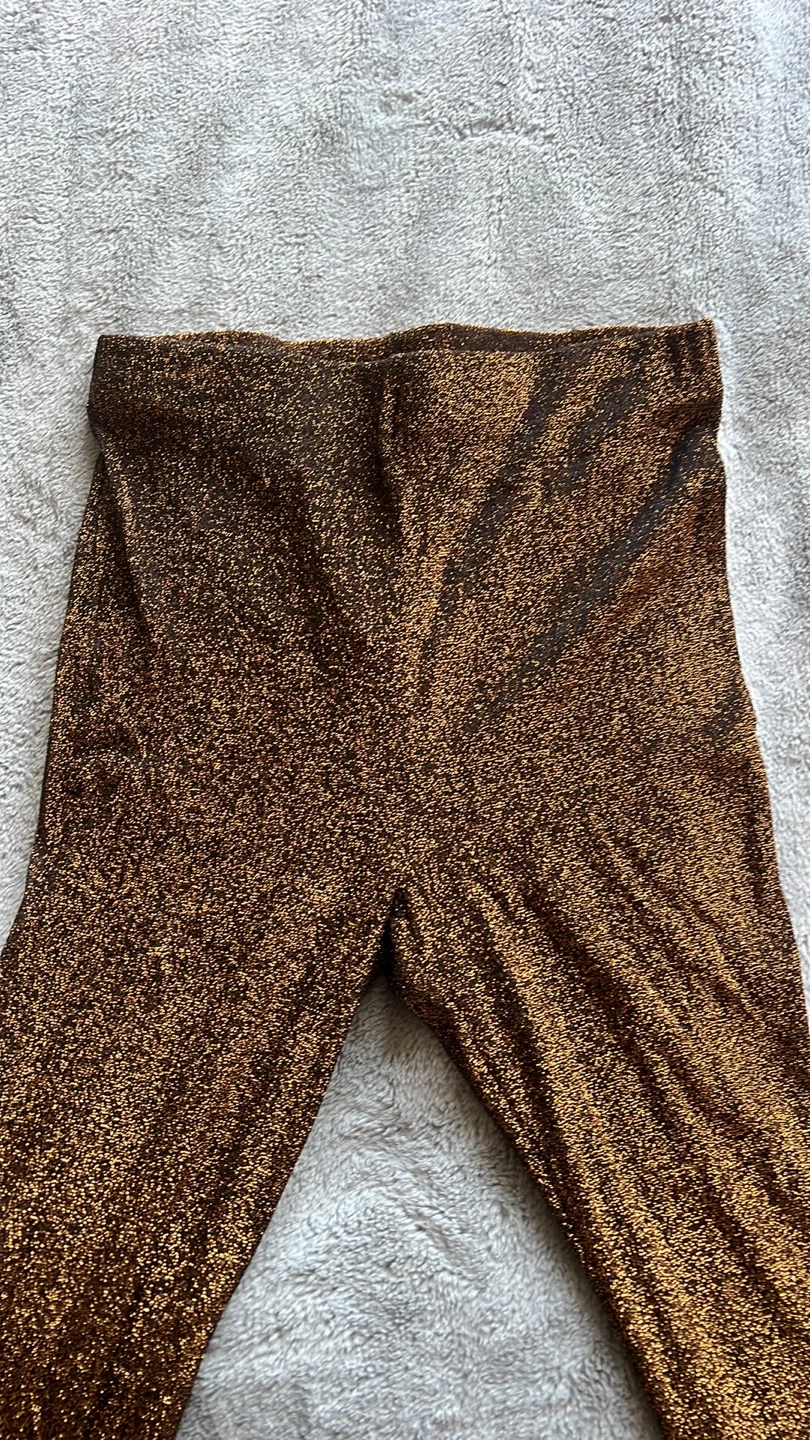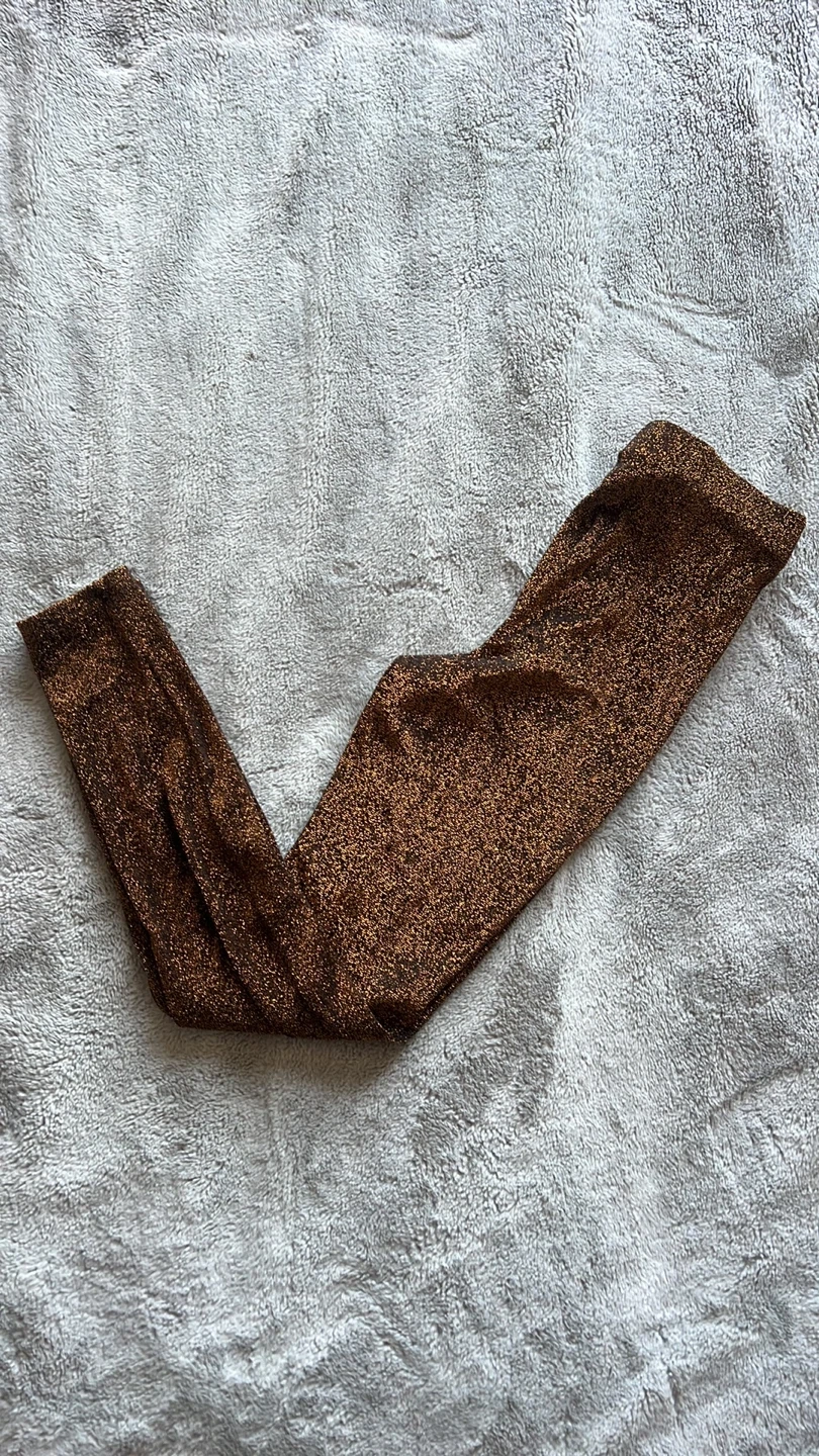 Shimmering brown leggings with a metallic sparkle finish. These leggings are made from a stretchy, comfortable fabric. They're perfect for adding a touch of glam to any outfit, wether for a night out or a festive occasion!