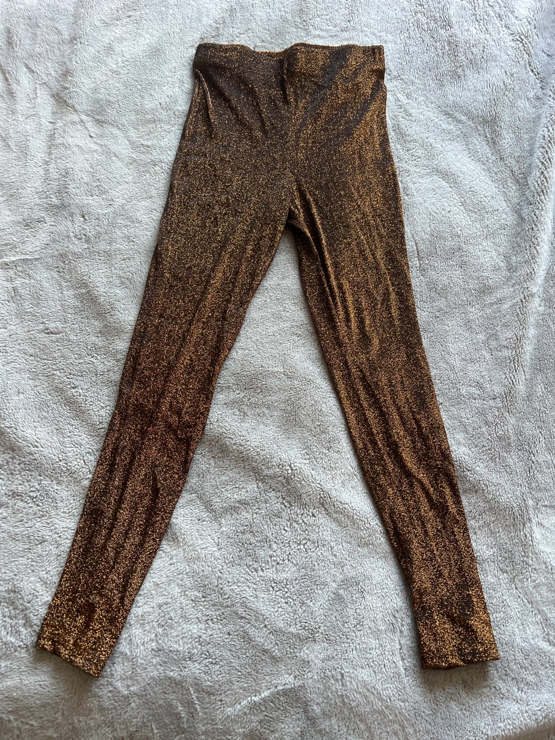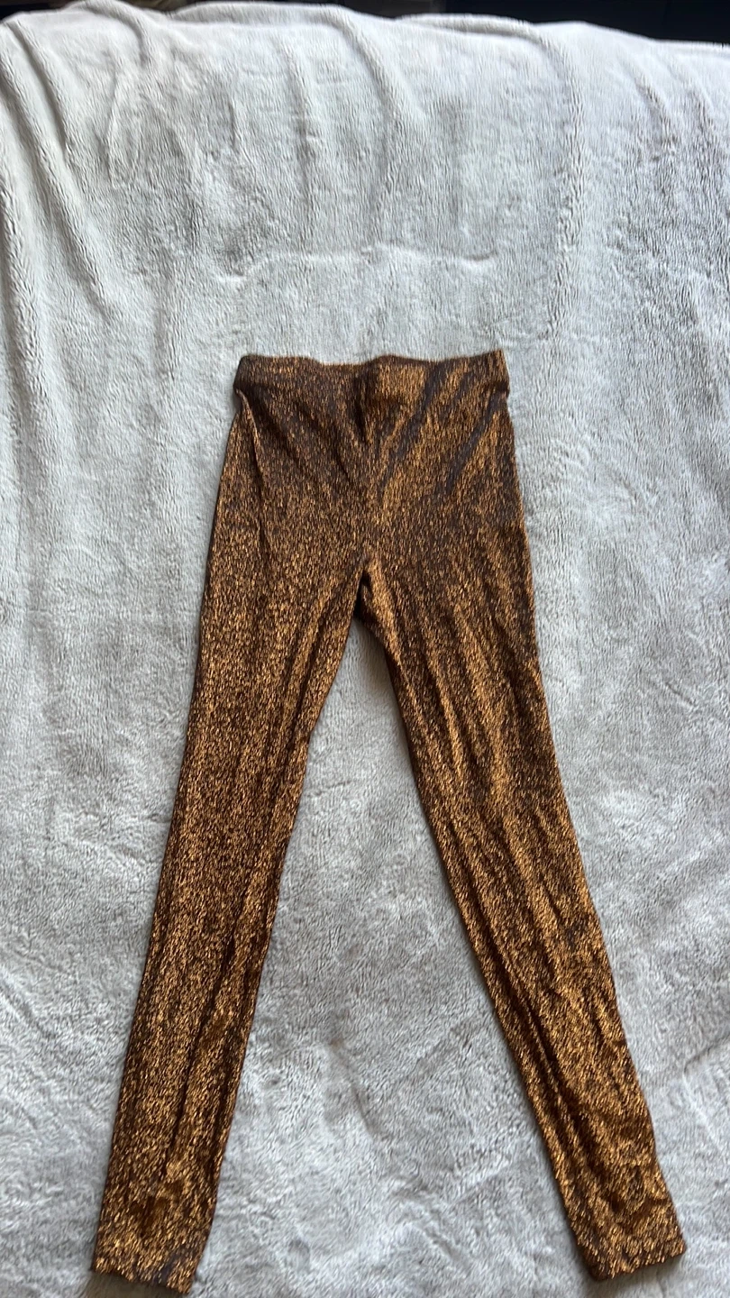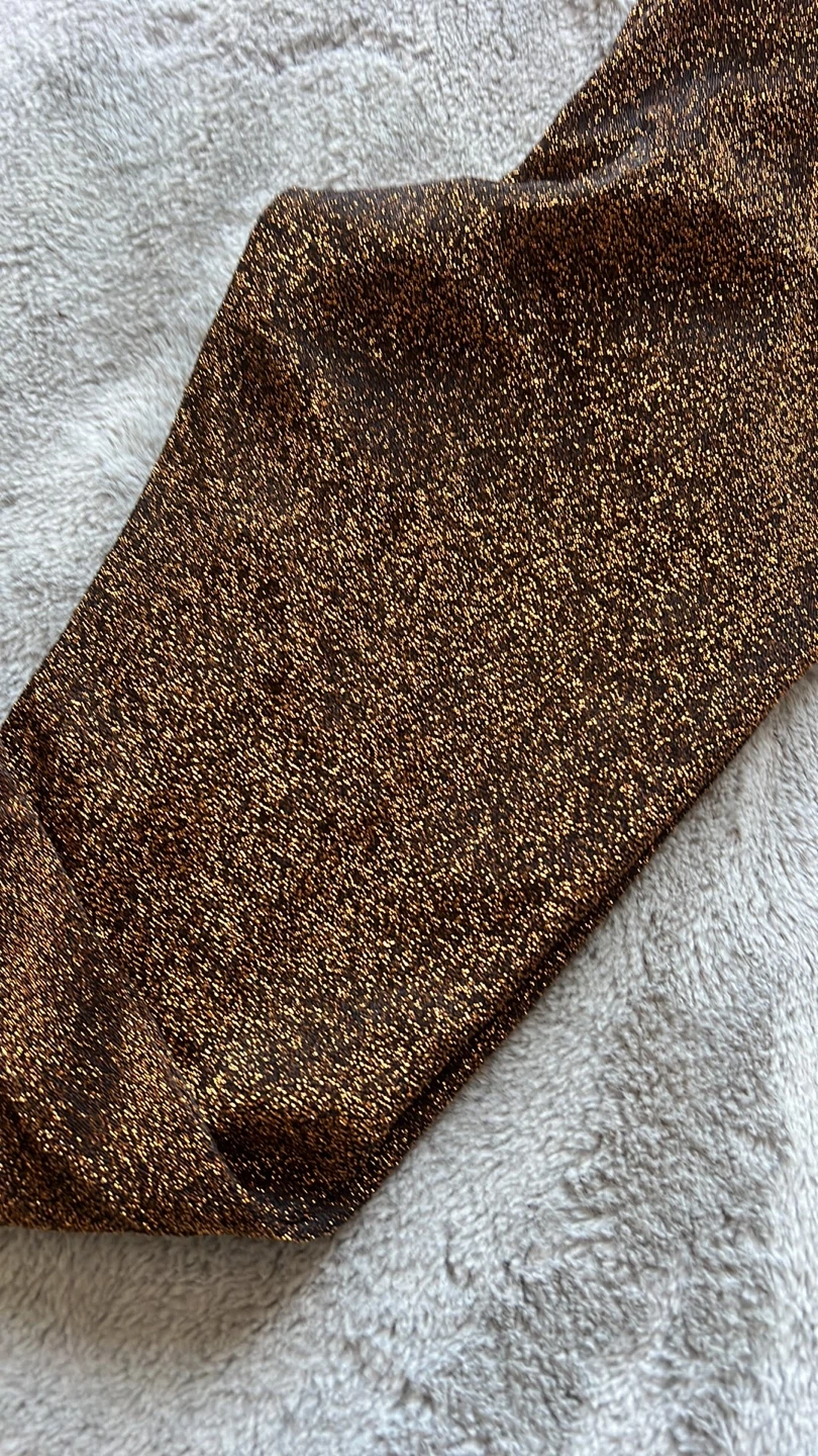 Shimmering brown leggings with a metallic sparkle finish. These leggings are made from a stretchy, comfortable fabric. They're perfect for adding a touch of glam to any outfit, wether for a night out or a festive occasion!