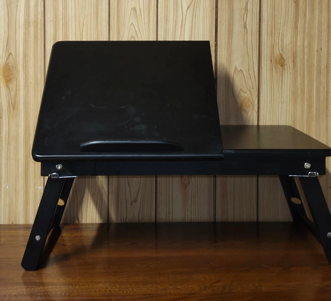 This black lap desk tray is foldable and adjustable. It has a built-in handle for easy carrying. Its compact design makes it convenient for use anywhere. Perfect for working or relaxing from your couch or bed!