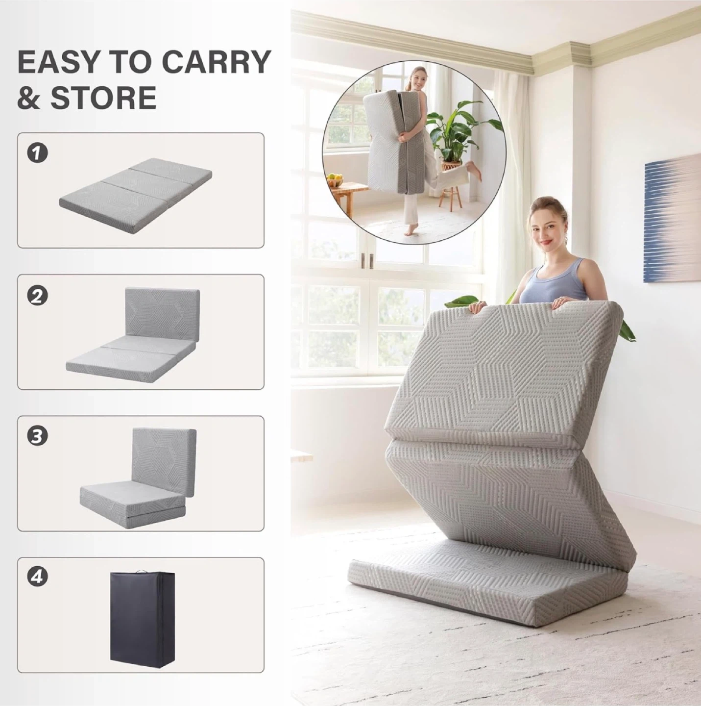 Selling a folding foam mattress that's easy to carry and store! It comes with a carrying case, making it super convenient. This mattress is perfect for guests, camping, or just relaxing at home. It can be easily folded into a chair or a compact size for storage