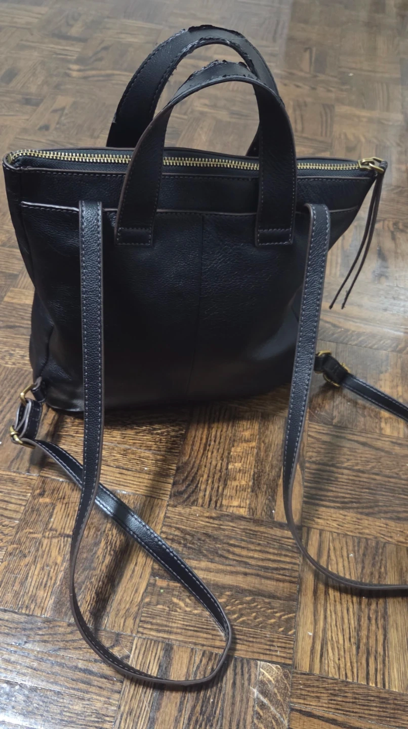 This is a gently used Fossil black leather convertible backpack. It can be used as a backpack or a tote bag. It's in great condition and ready for a new owner!