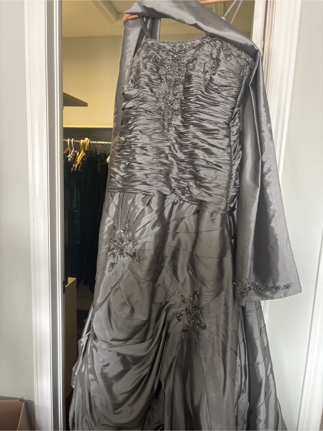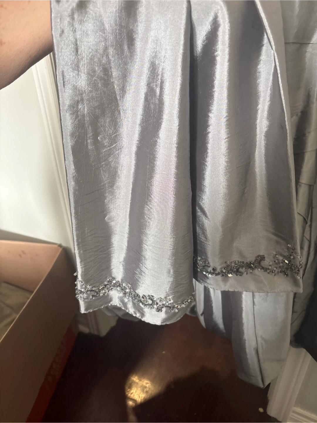 Silver formal gown from Amanda-Lina's Sposa Boutique. This elegant dress features intricate beading and ruching details throughout. Includes scarf with beading. Size 16. It's perfect for special occasions and formal events! Only worn once for daughters wedding.