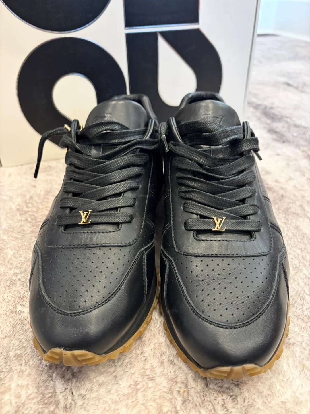 These Louis Vuitton x Supreme sneakers are crafted from black leather with a perforated design. They feature a durable gum sole and gold-tone detailing. Includes original box and Supreme hang tag and LV box and bag
